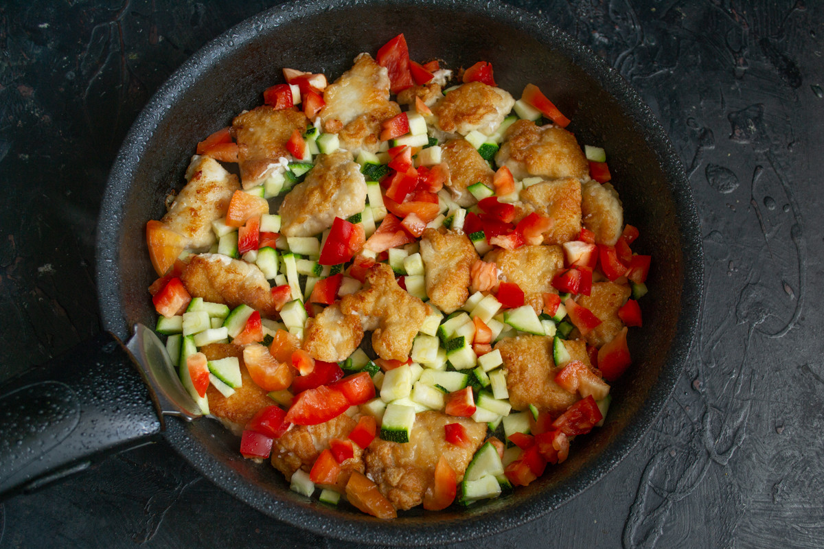 Сладкий перец и кабачки очищаем от семечек, если у кабачка кожура тонкая, то её можно оставить. Нарезаем кабачок и перец маленькими кубиками, добавляем к обжаренной курице. Обжариваем всё вместе на небольшом огне 5 минут, пока овощи не станут мягкими.