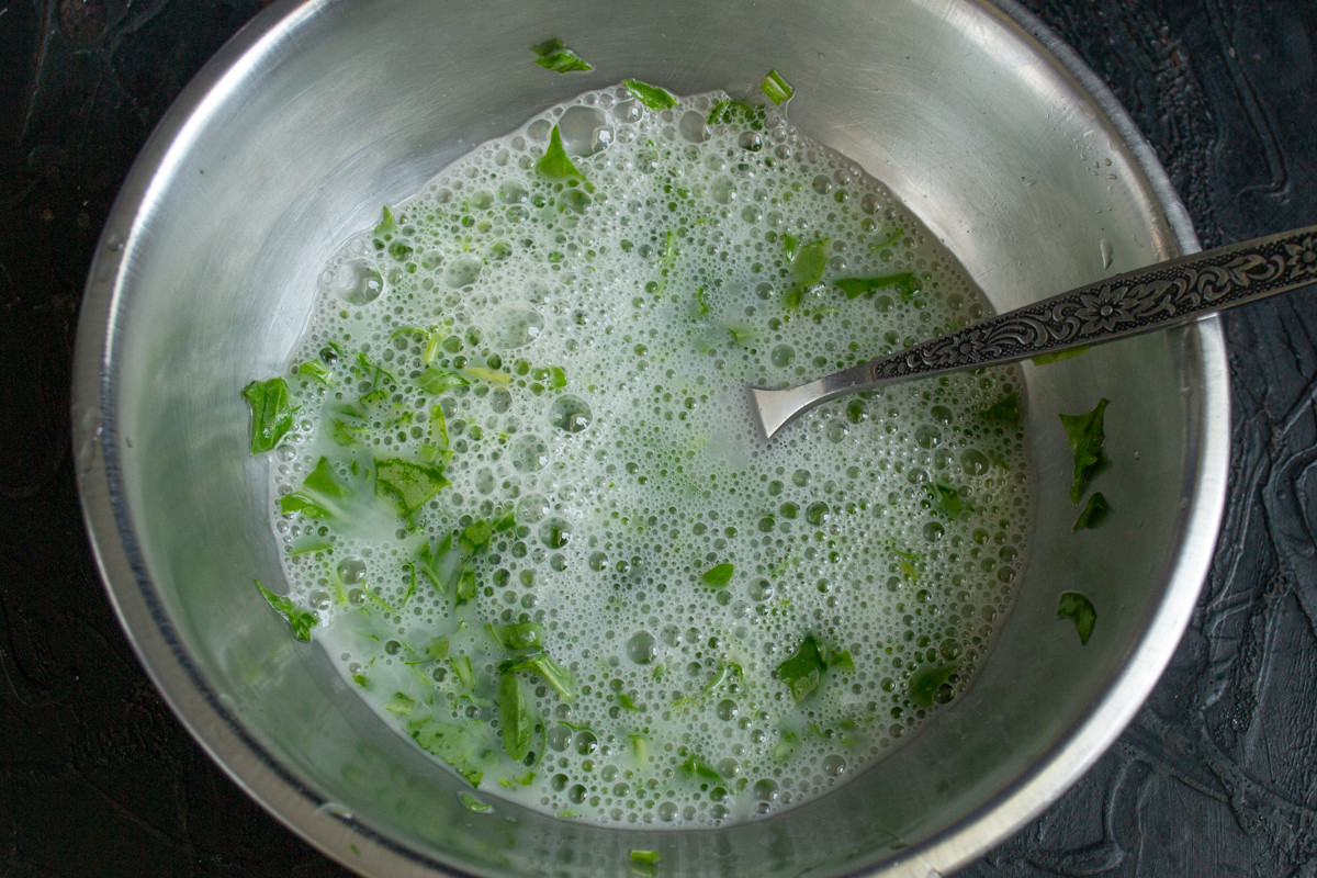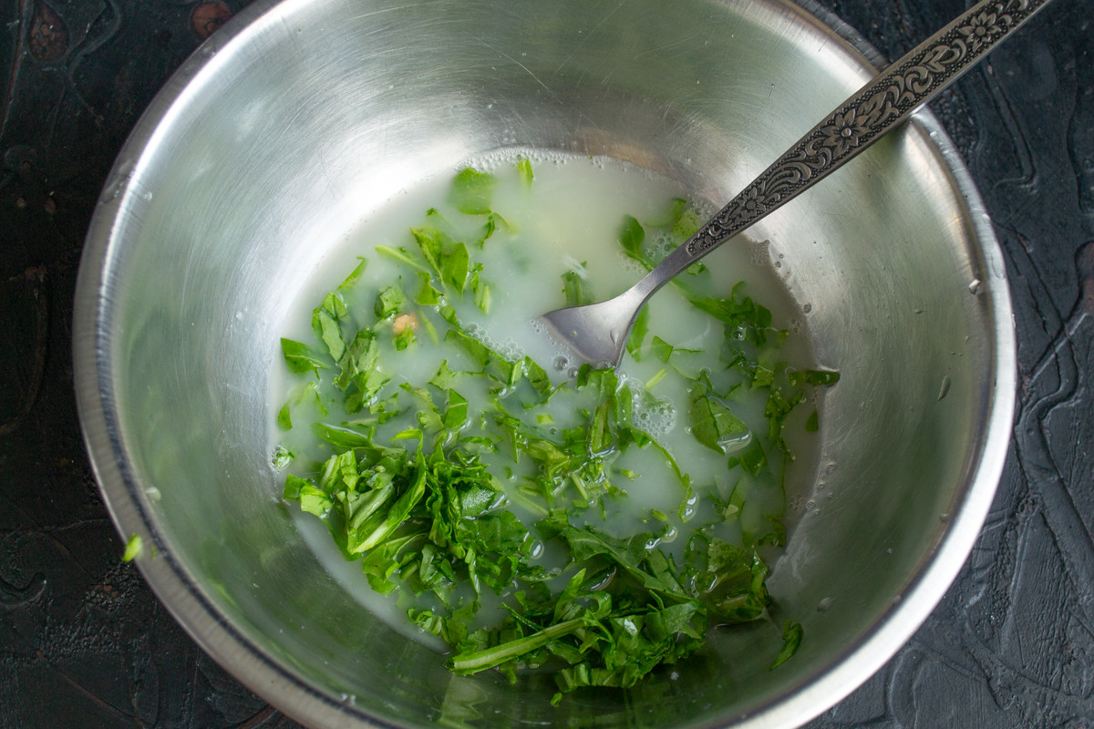 Наливаем в миску рассол из-под моцареллы, добавляем мелко нарезанную руколу. Добавляйте руколу в соусы и горячие блюда, эта пряная травка годится не только для салатов.
