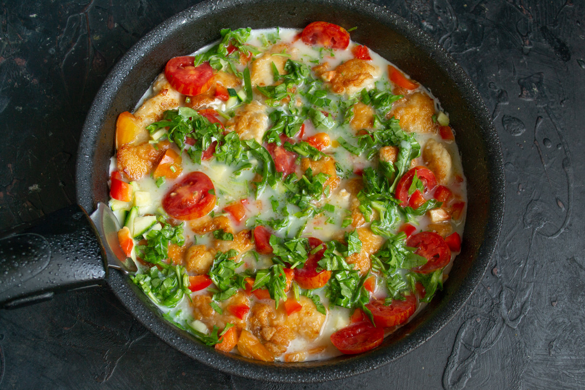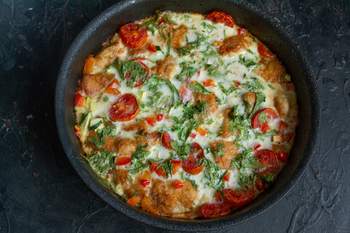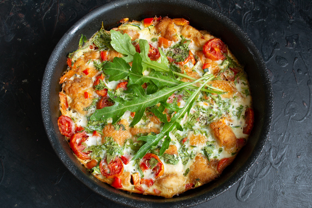 Готовить можно из всего что под рукой, частенько это блюдо сооружают из остатков вчерашнего ужина. В моём рецепте кабачки, сладкий перец, помидоры, рукола и куриная грудка. А вместо молока, которое обычно смешивают с яйцами – рассол от моцареллы. Быстро, вкусно и легко, можно сделать и на завтрак, и на ужин.