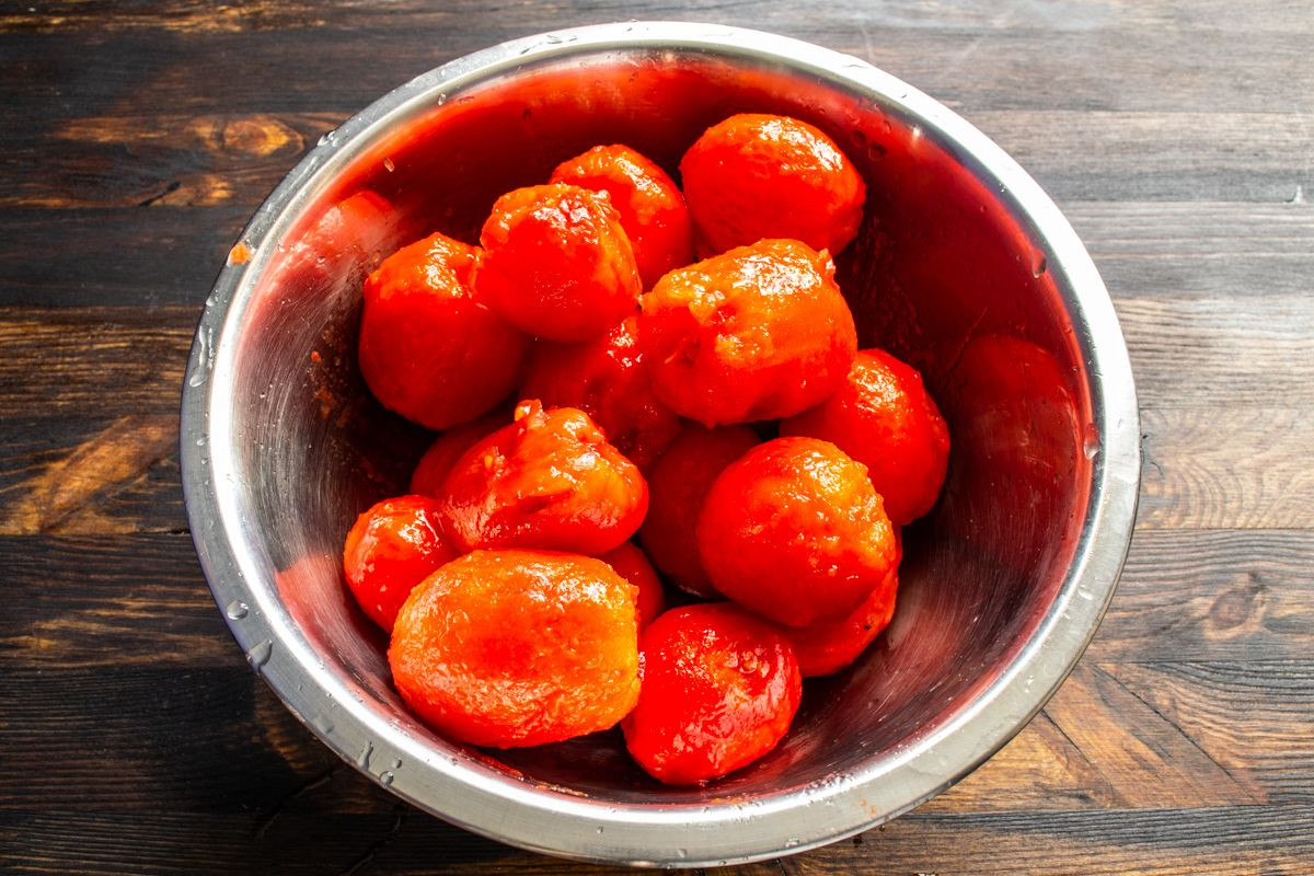 Для этого рецепта выбираем помидоры с плотной мякотью. Подходят зрелые плоды без повреждений и признаков порчи. Помидоры тщательно моем. На плиту ставим большую кастрюлю с водой, нагреваем до кипения. Рядом ставим миску с холодной водой. Небольшими партиями опускаем помидоры в кипящую воду на полминуты. Сразу перекладываем в миску с холодной водой. Надрезаем кожицу с тыльной стороны, аккуратно снимаем. Вырезаем уплотнение возле плодоножки.