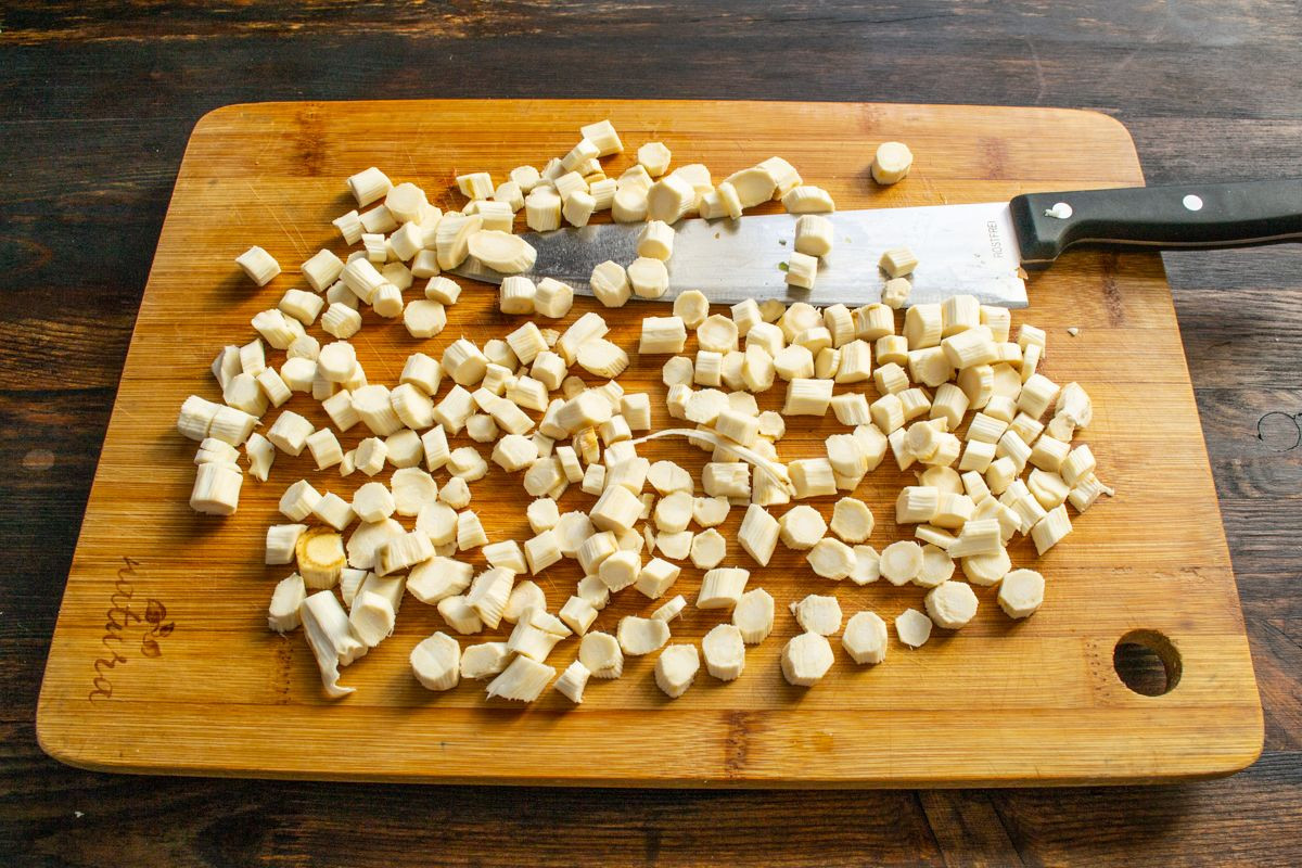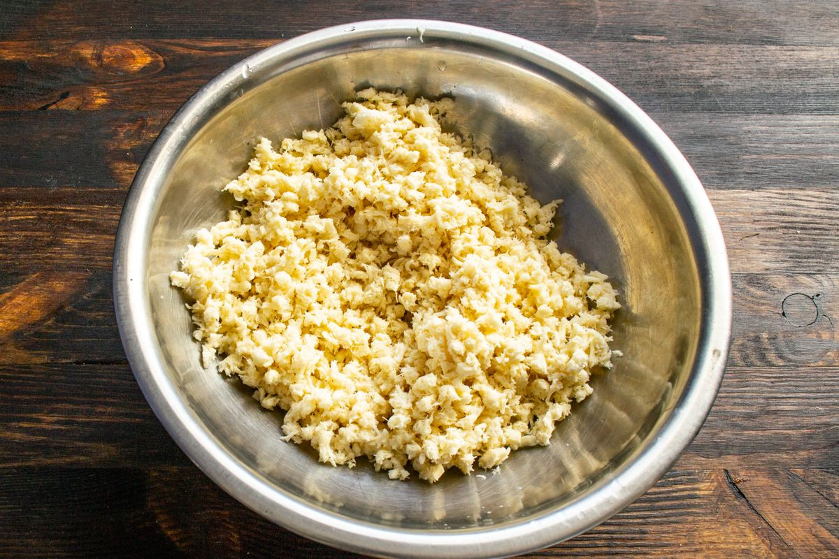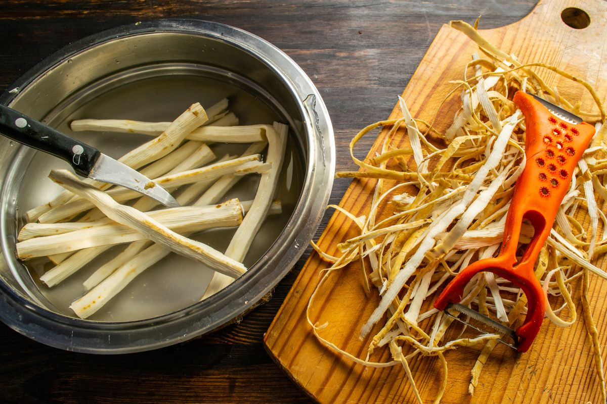 Корни хрена замачиваем в холодной воде. Затем тщательно моем абразивной мочалкой. Скоблим отмытый хрен овощным скребком. Очищенные корни кладем в миску с холодной водой.