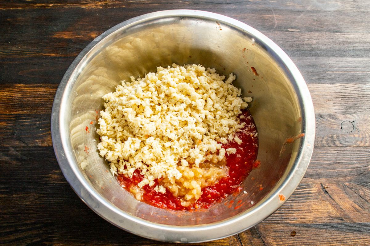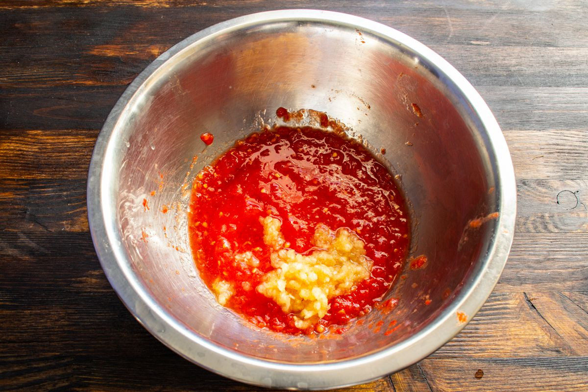 Помидоры разрезаем, по желанию удаляем семена, так будет меньше влаги. Зубчики чеснока чистим от шелухи. Пропускаем через мясорубку помидоры и чеснок.