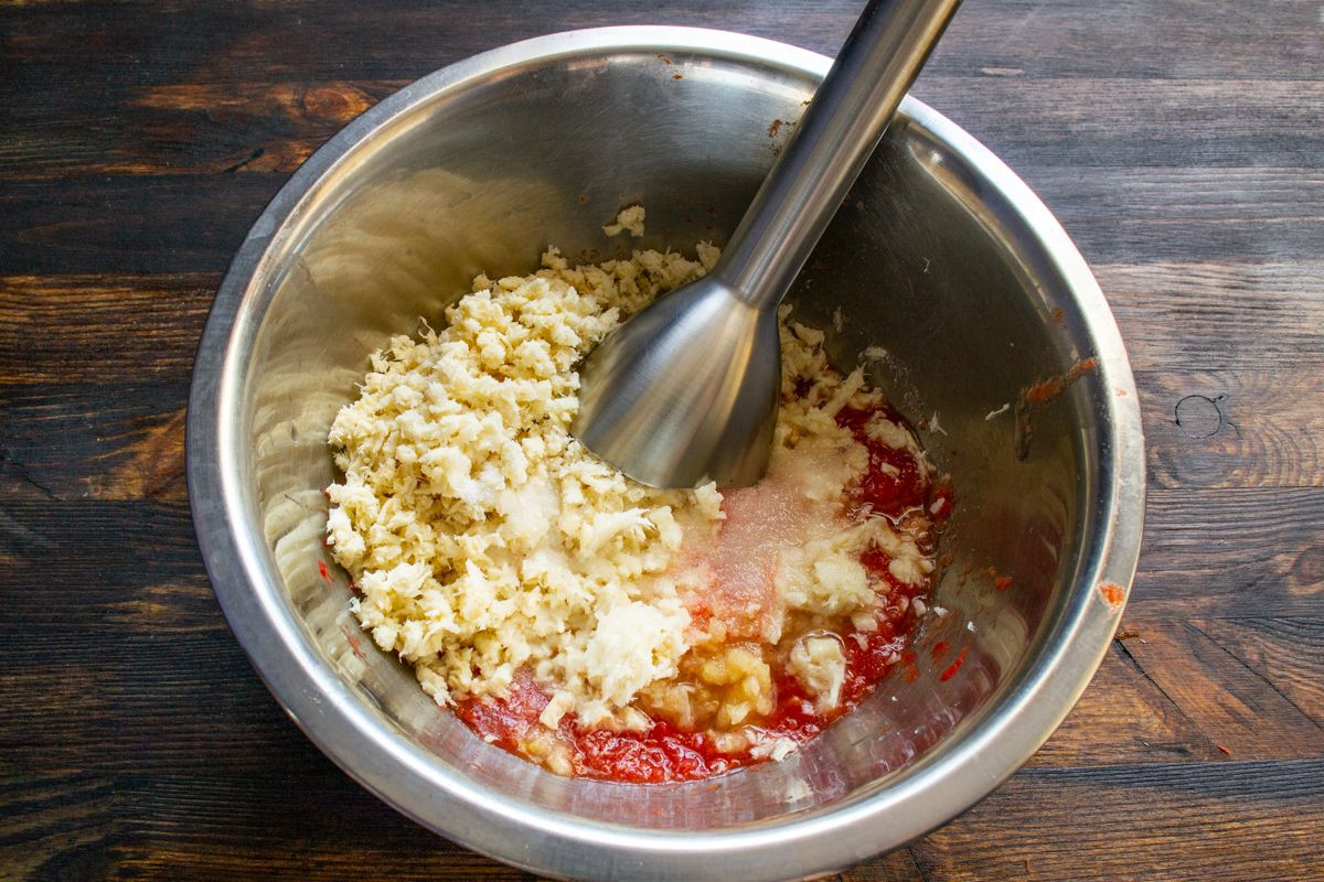 Далее можно просто перемешать ингредиенты ложкой и разложить в банки. Но мне нравится хреновина с более мелкой текстурой, в этом поможет блендер.