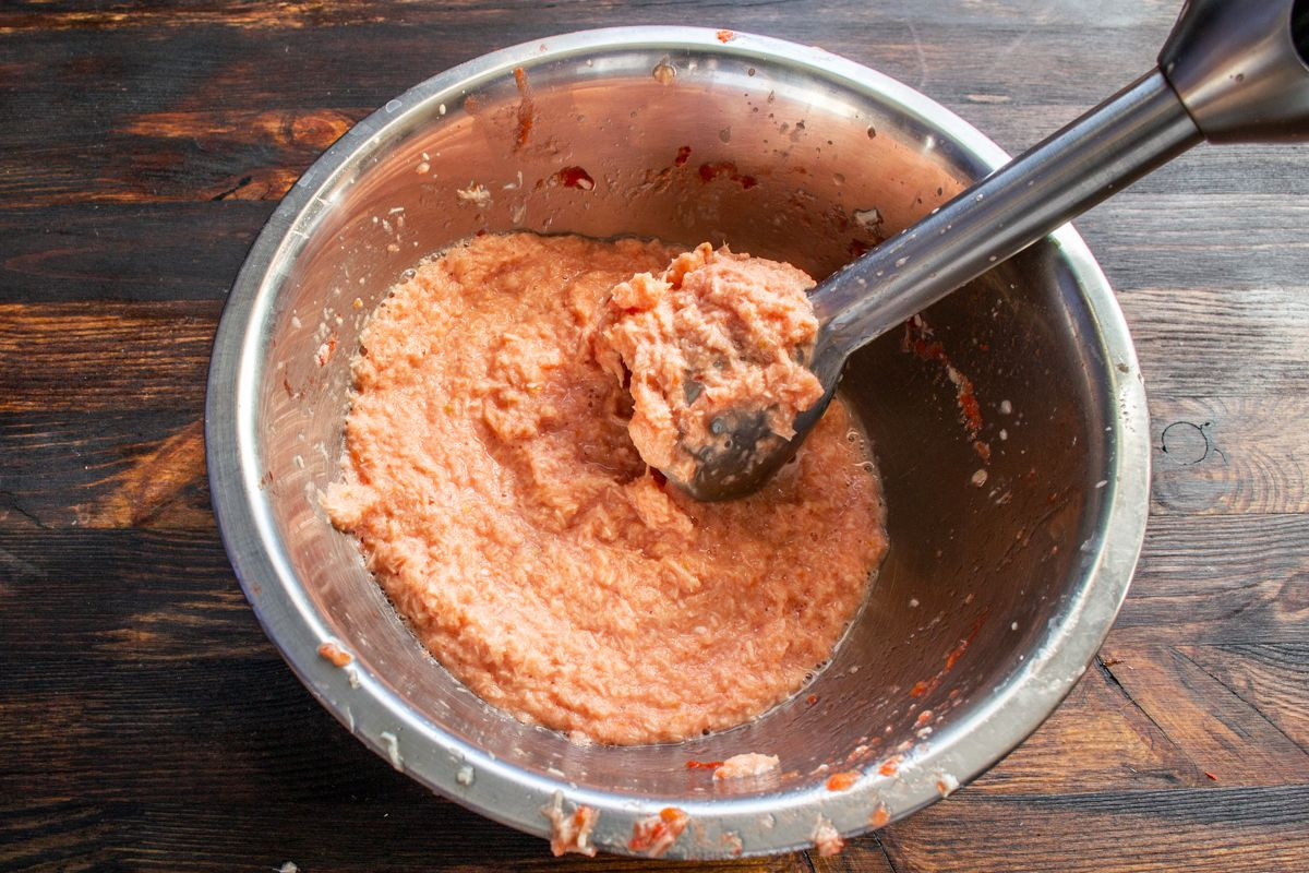 С помощью погружного блендера измельчаем ингредиенты несколько минут, пока не получится однородное пюре.