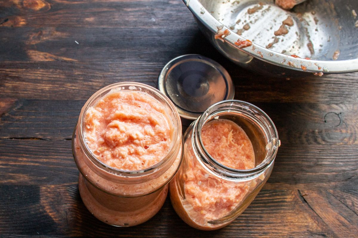 Тщательно моем банки и крышки в теплой воде с питьевой содой. Ополаскиваем банки кипятком. Можно дополнительно стерилизовать над паром или высушить в горячей духовке. Раскладываем хреновину в сухие чистые банки, уплотняем, чтобы не осталось воздушных карманов. Завинчиваем герметично. Убираем на хранение в холодное место. Температура хранения от +2 до + 4 градусов по Цельсию. Я храню этот соус в холодильнике.