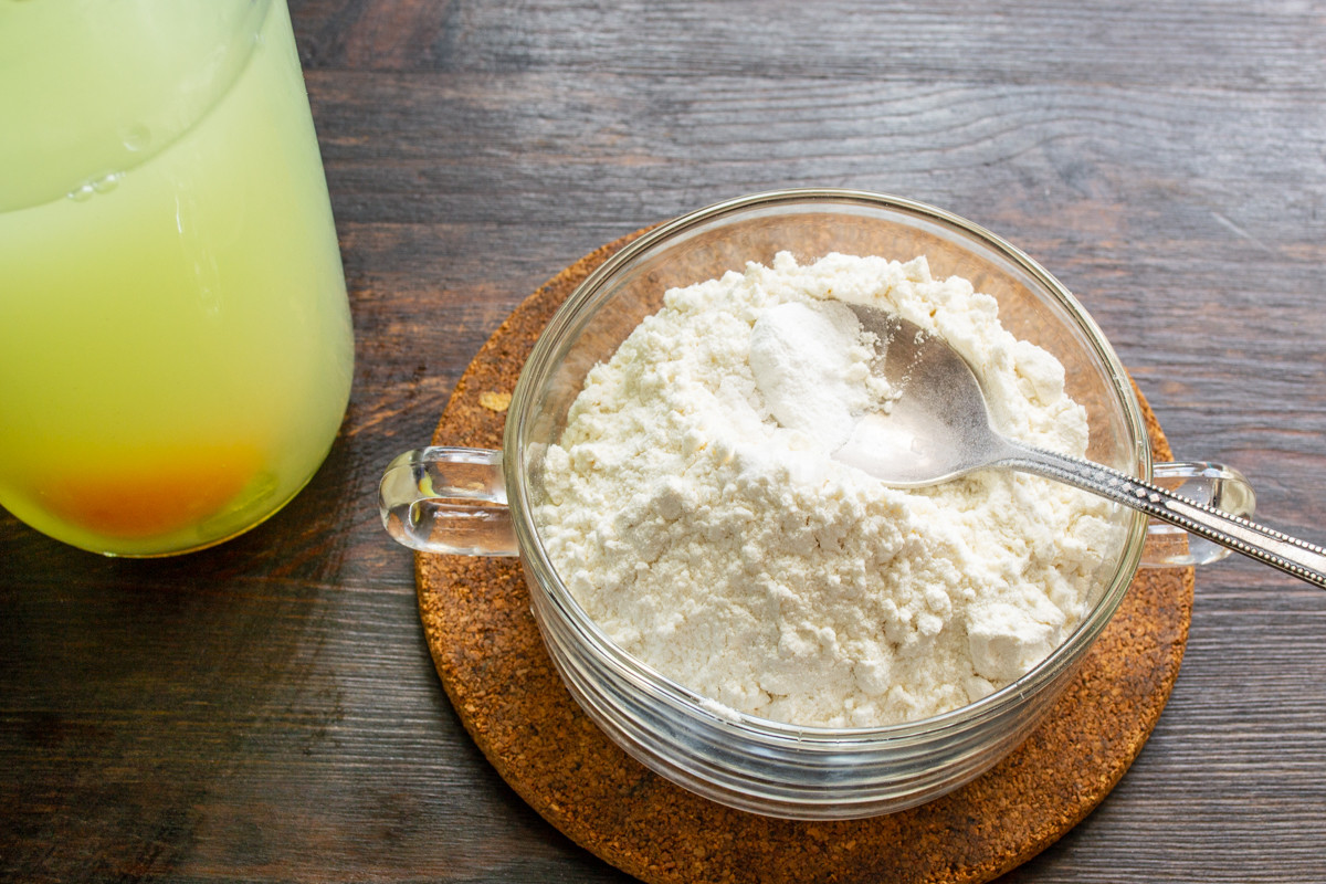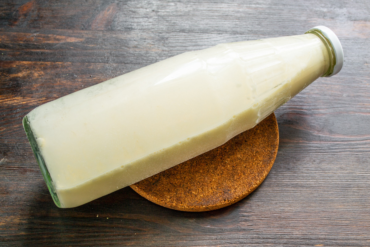 По очереди добавляем в бутылку все продукты. Для указанного в рецепте количества ингредиентов достаточно литровой бутылки. Сначала вливаем молочную сыворотку или пахту. Вы можете использовать любой молочный продукт. Молоко или кефир советую развести водой в соотношении 1 к 1.