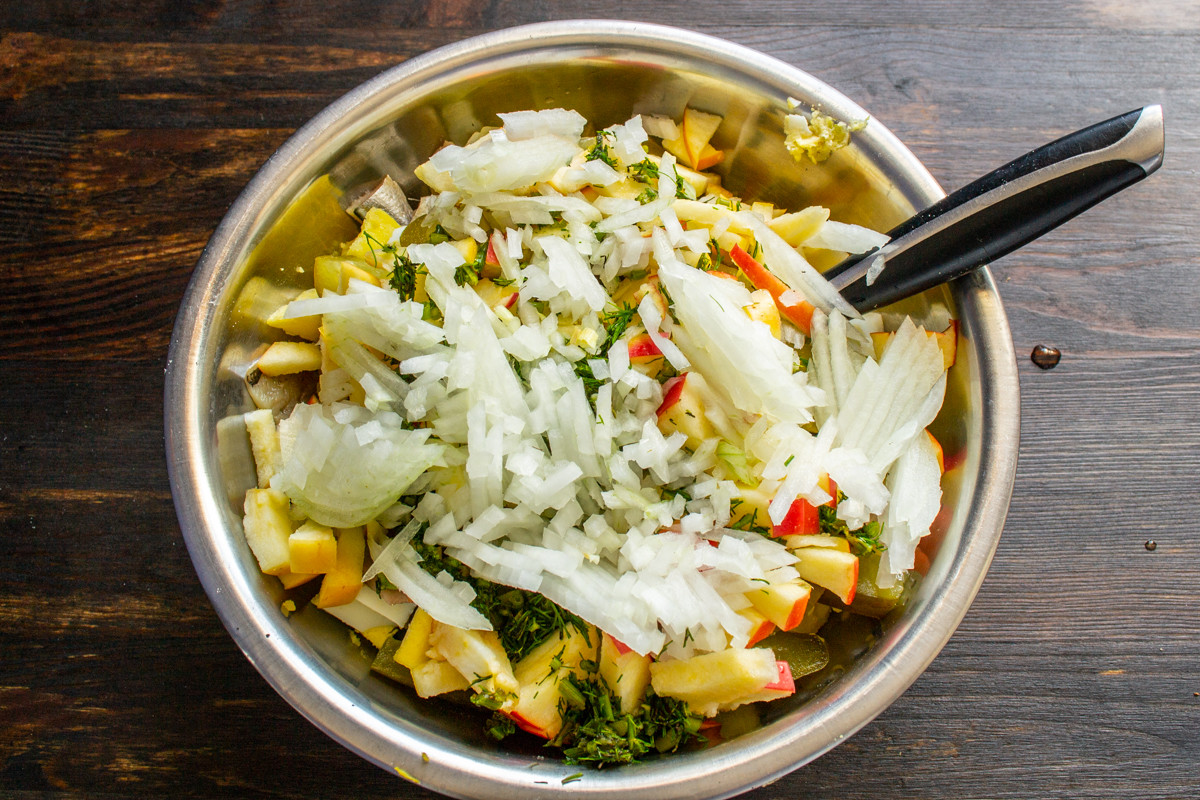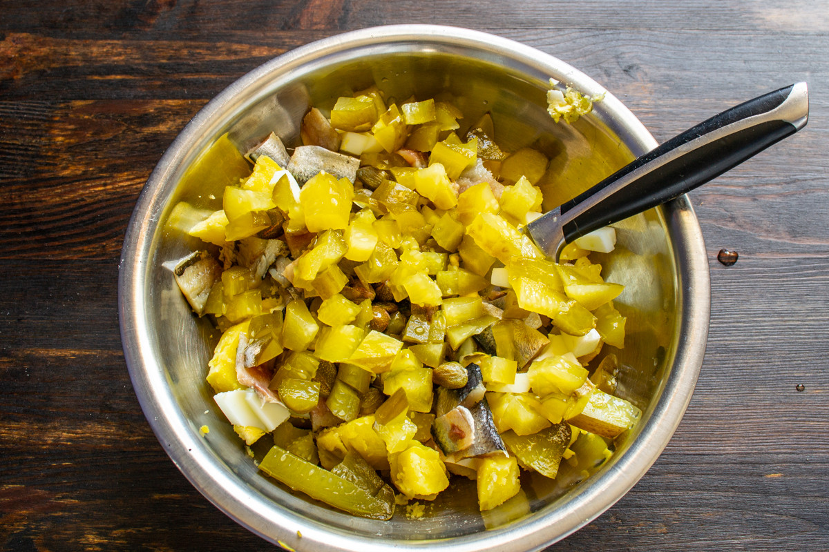 Хорошо перемешиваем салат. Убираем в холодильник на полчаса–час, чтобы продукты перезнакомились и картофель пропитался соками.