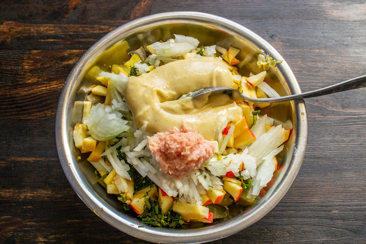 Добавляем майонез и хрен. Я готовлю майонез сама: 1 чайная ложка столовой горчицы, 1 чайная ложка сахара, щепотка соли, 1 сырой желток, 1 столовая ложка лимонного сока, черный перец и растительное масло. Сначала взбиваем желток с горчицей, солью и сахаром, затем вливаем по капельке растительное масло до желаемой консистенции (нужно примерно 60 г), в конце лимонный сок.