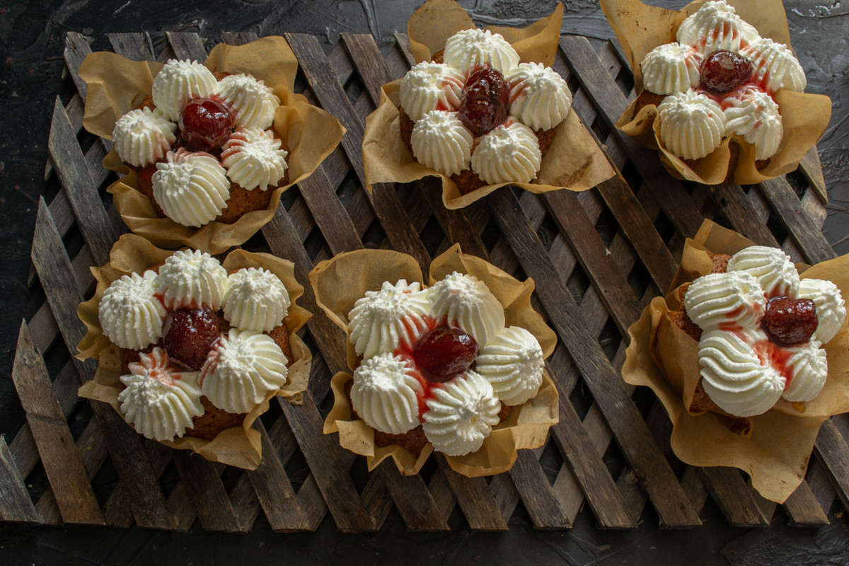 Когда испеченные кексы полностью остынут, делаем крем для украшения. Холодные жирные сливки взбиваем с сахарной пудрой до устойчивых пиков. Можно добавить чайную ложку загустителя сливок, так крем гарантированно будет стабильным. Перекладываем сливки в мешок с фигурным наконечником, украшаем кексы.