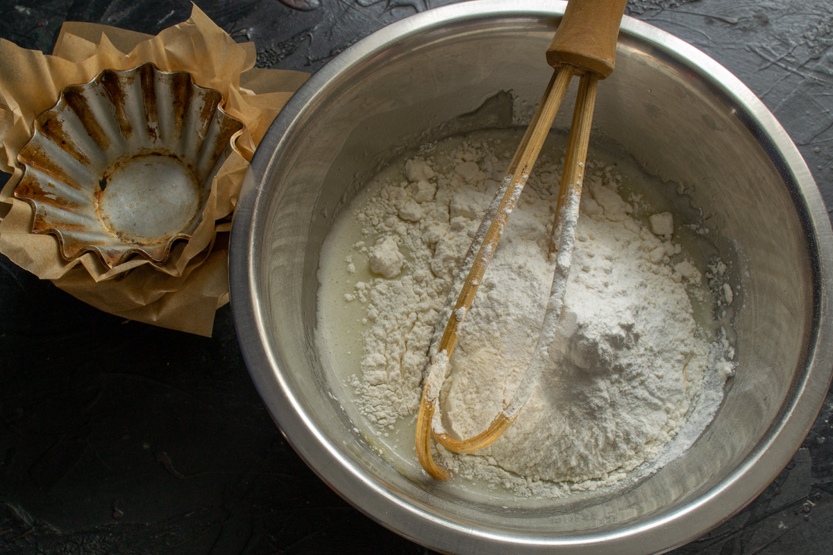 Хорошо перемешиваем муку с жидкими ингредиентами, в тесте не должно быть комков муки.