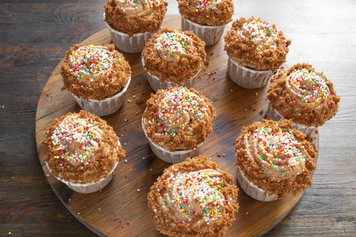 Готовые кексы украшаем кондитерским конфетти, оставляем в холодильнике. Приятного аппетита!