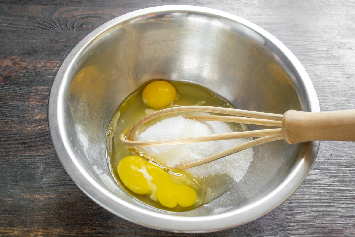 Готовить тесто можно с помощью кухонного комбайна или вручную, делайте так, как вам удобно. Разбиваем в чашу куриные яйца, насыпаем мелкий белый сахар-песок.