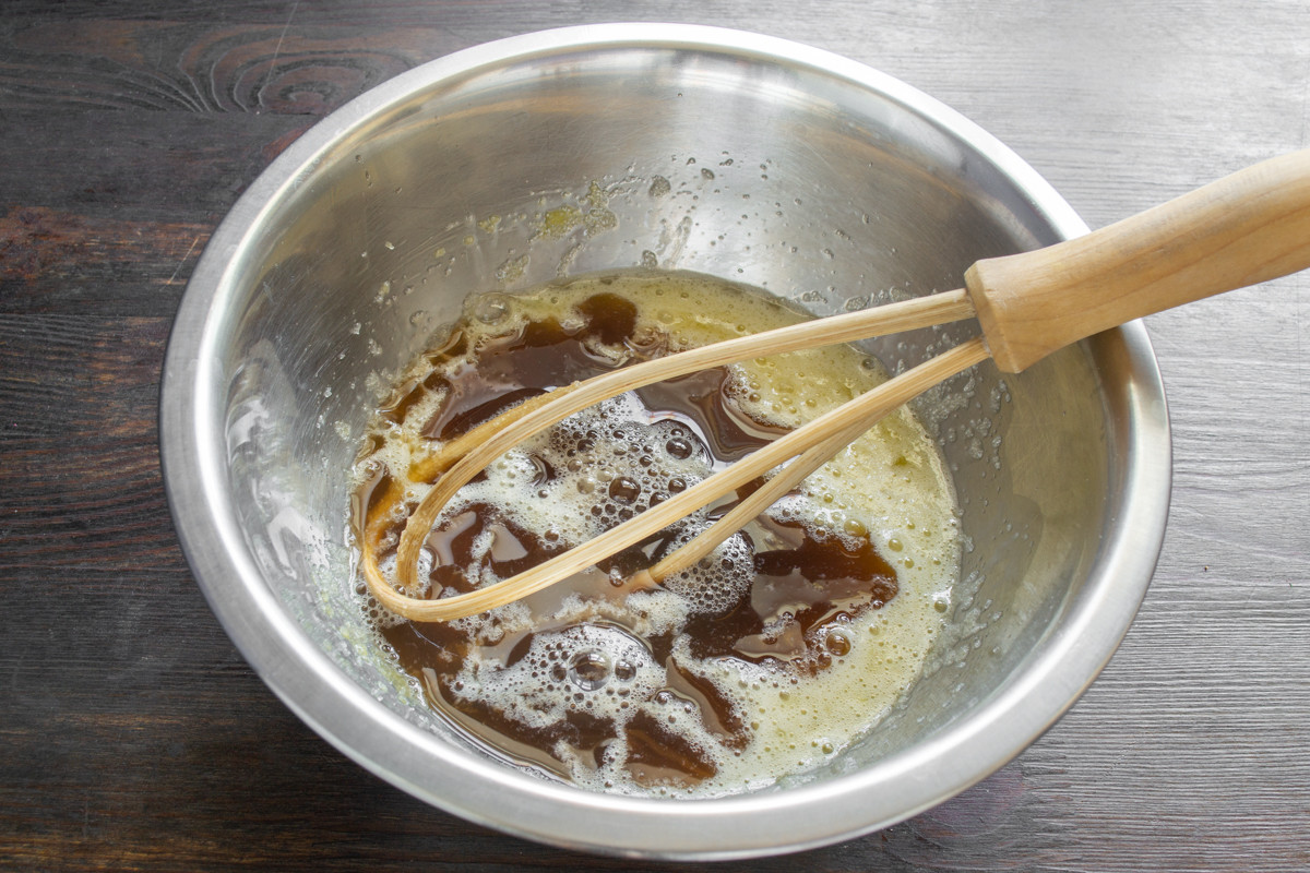 Взбиваем яйца с сахаром венчиком. Наливаем кока-колу и снова перемешиваем жидкие ингредиенты венчиком. Продукты для приготовления теста должны быть комнатной температуры.