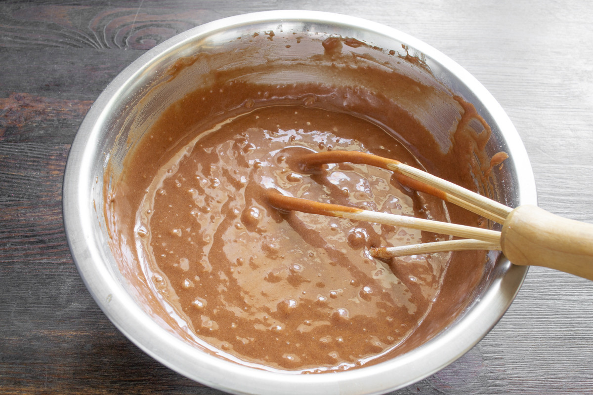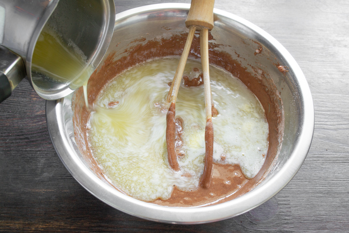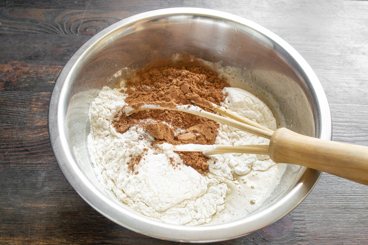Пшеничную муку высшего сорта или муку для торта смешиваем с разрыхлителем теста. Добавляем к жидким ингредиентам муку с разрыхлителем и несладкий какао-порошок. Используйте качественную муку из твердых сортов пшеницы для выпечки бисквитов.