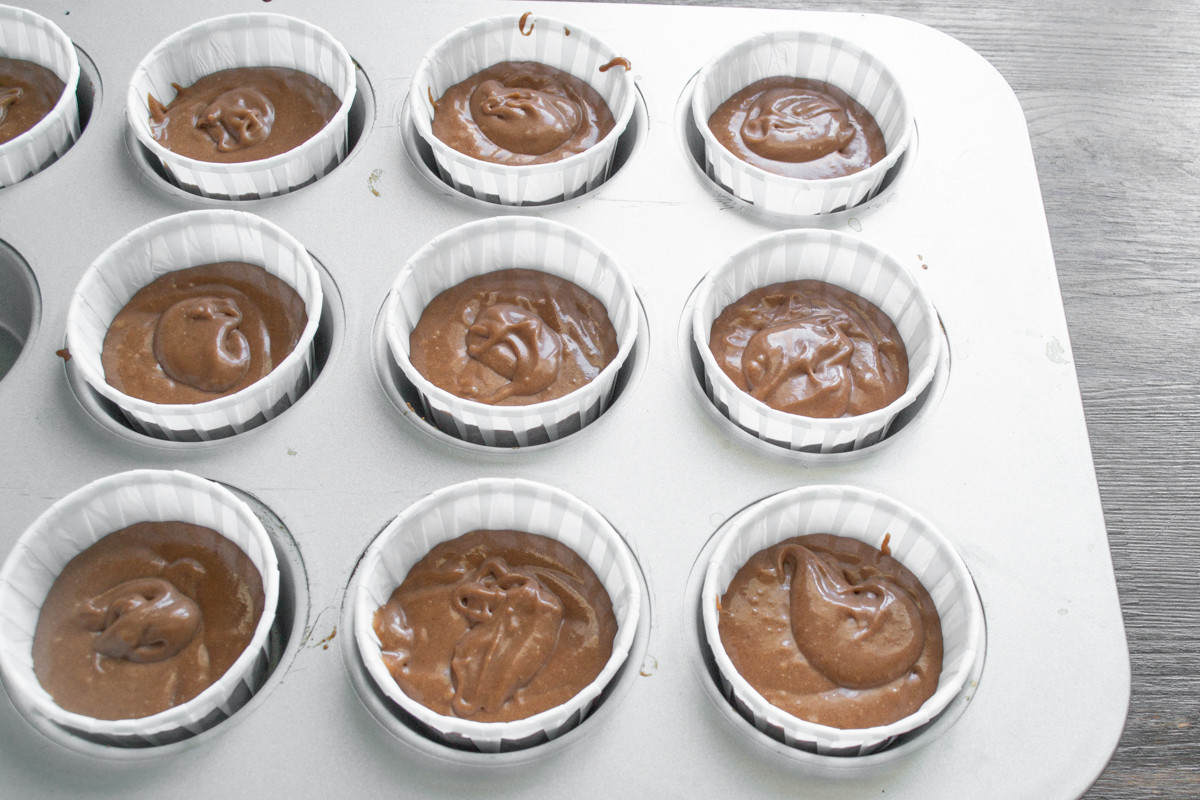 В противень для кексов вставляем бумажные вкладыши. Наполняем вкладыши тесто примерно на 2/3. Чтобы все кексы получились одинаковыми, рекомендую взвешивать порции.