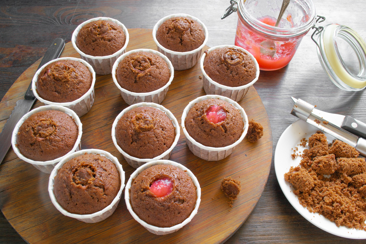 У остывших кексов вырезаем серединку и наполняем её любым густым фруктовым джемом. Вырезанный бисквит оставляем для украшения.