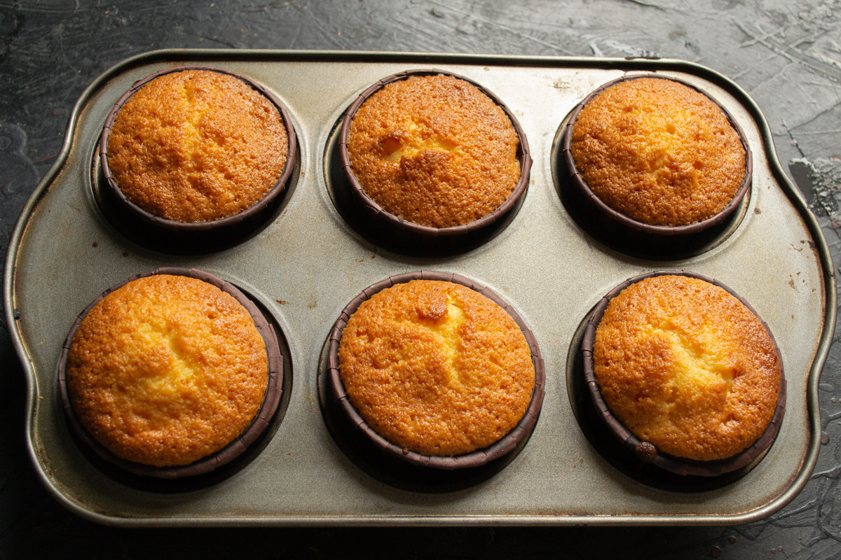 Ставим форму в разогретую духовку, выпекаем 25 минут до золотистого цвета. Готовность можно проверить деревянной шпажкой или нажать пальцем на верхушку кекса, если тесто пружинит и не проседает, то кексы хорошо пропеклись.