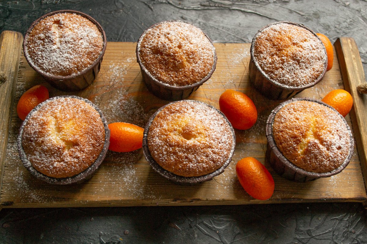 Готовые кексы с кумкватом достаём из формы, немного остужаем и посыпаем сахарной пудрой. Подаём к чаю или кофе.