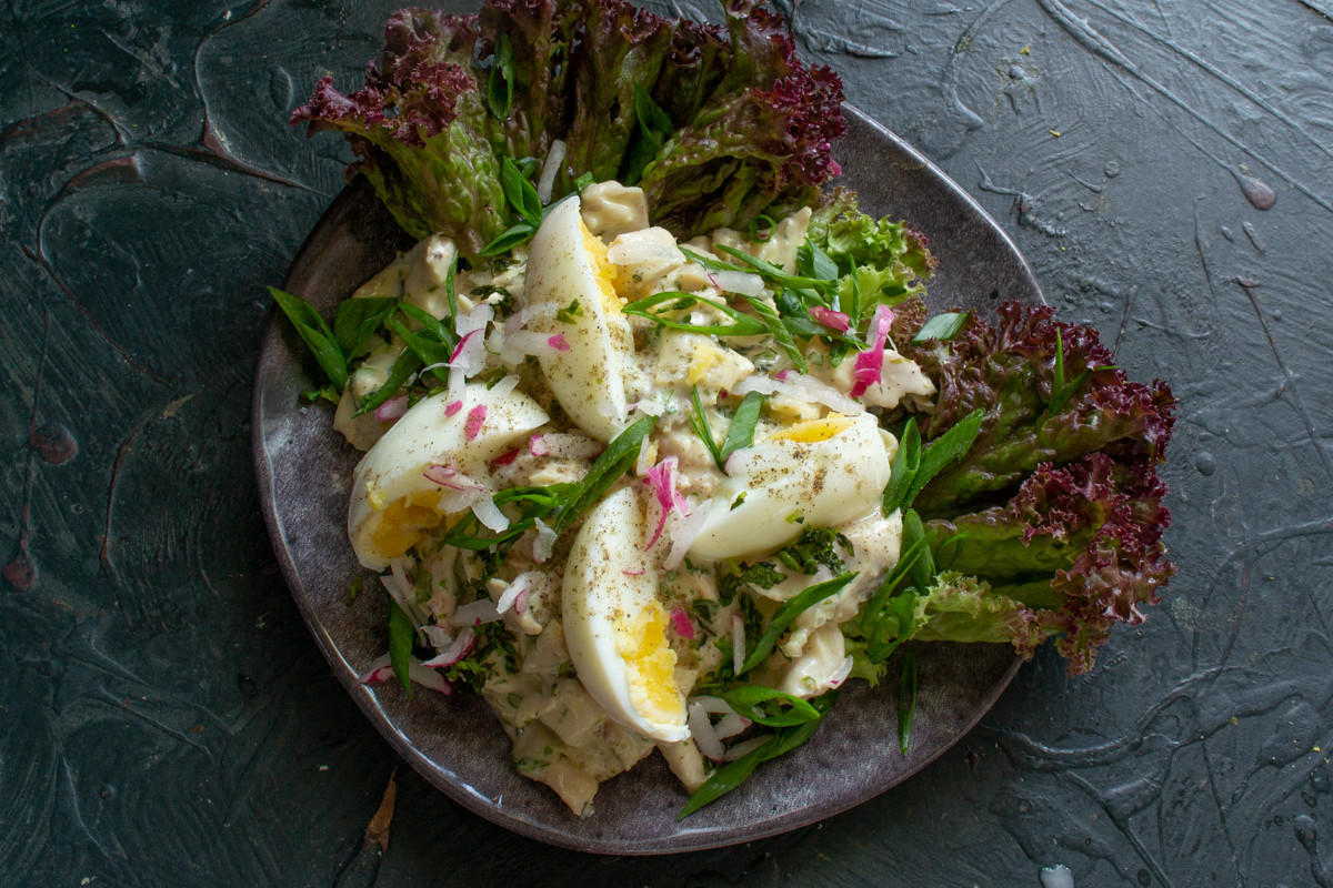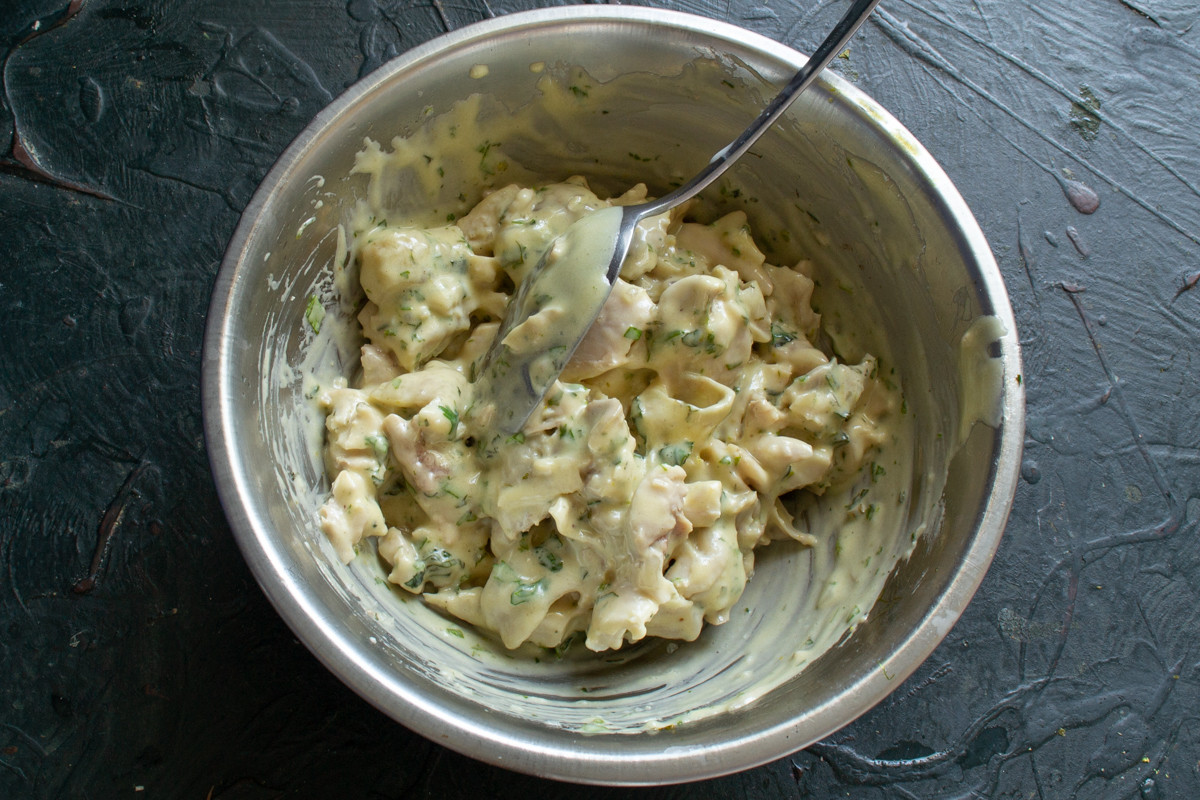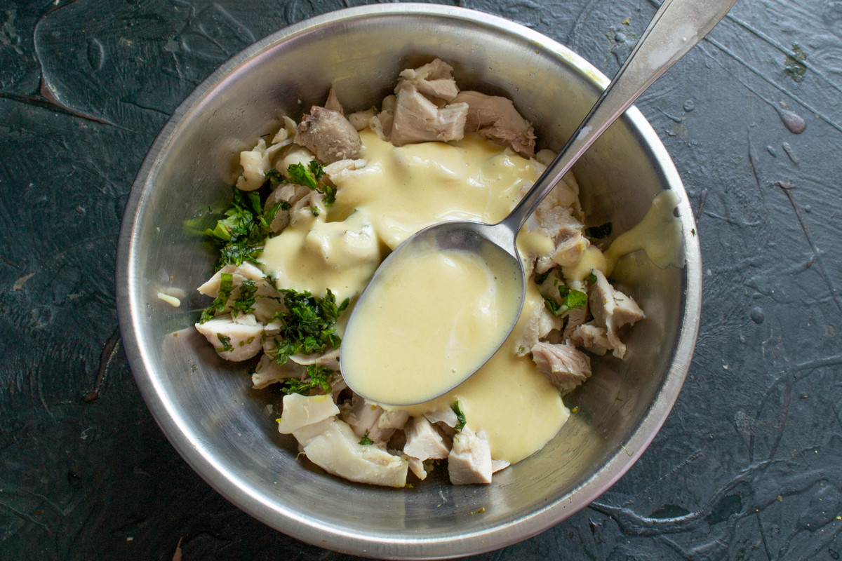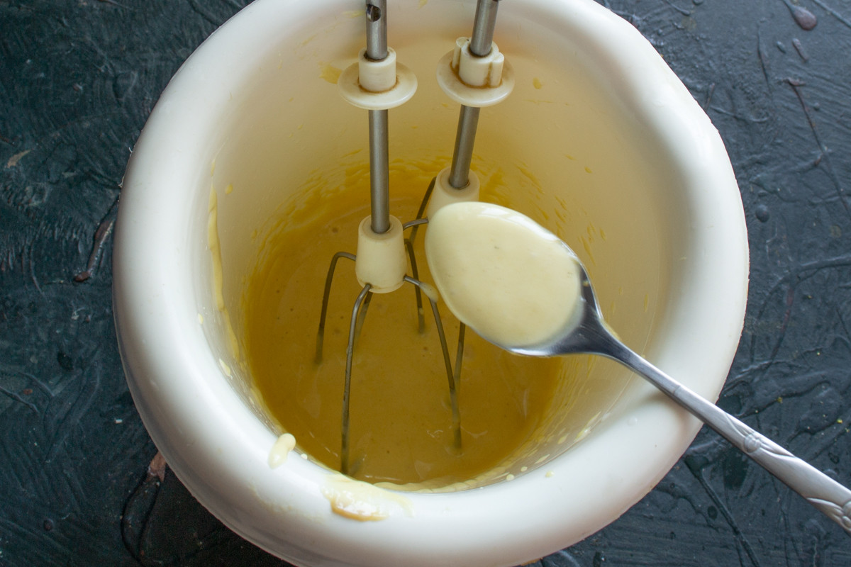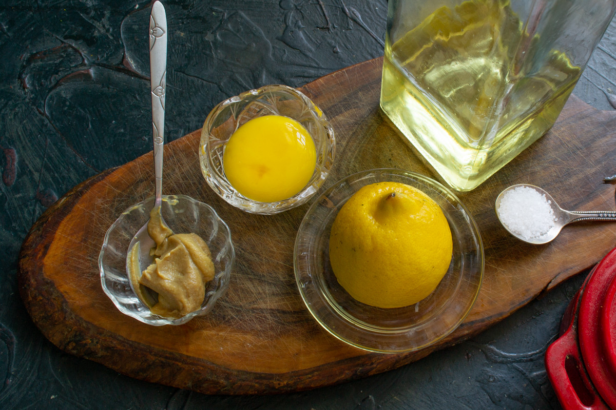 Начинаем с соуса. Это классический оливковый майонез со свежевыжатым лимонным соком и горчицей. Горчицу я готовлю сама, без сахара и без уксуса, также с лимонным соком и оливковым маслом.