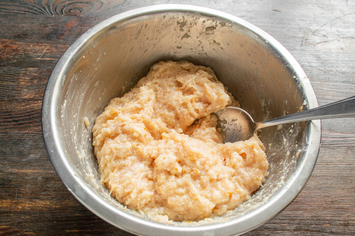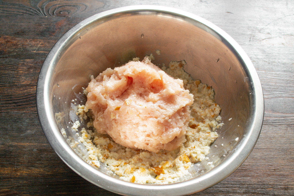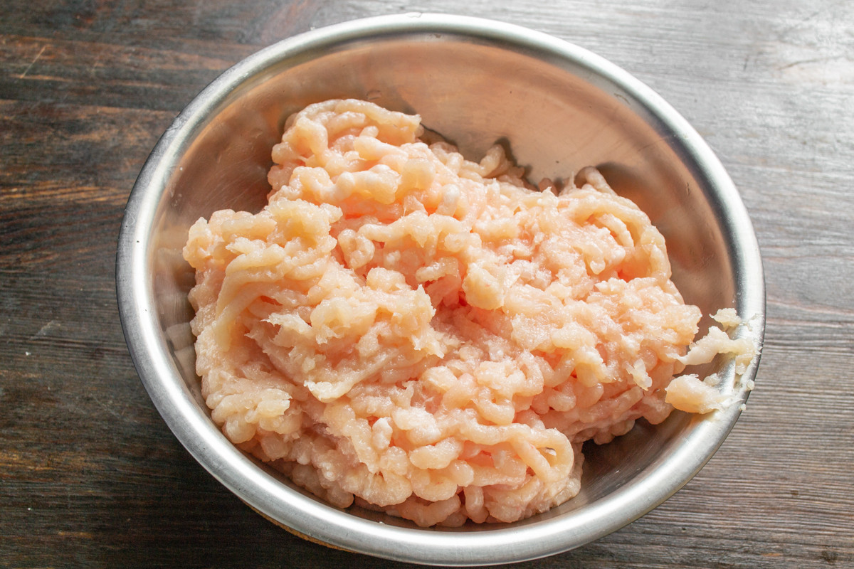 Вы можете использовать готовый куриный фарш в этом рецепте или перемолоть в мясорубке куриное филе и несоленое свиное сало. Домашний фарш вкуснее, и точно известно из чего он приготовлен. В перемолотый в мясорубке фарш я советую добавить 30-35 мл холодной воды и тщательно вымесить, как тесто.