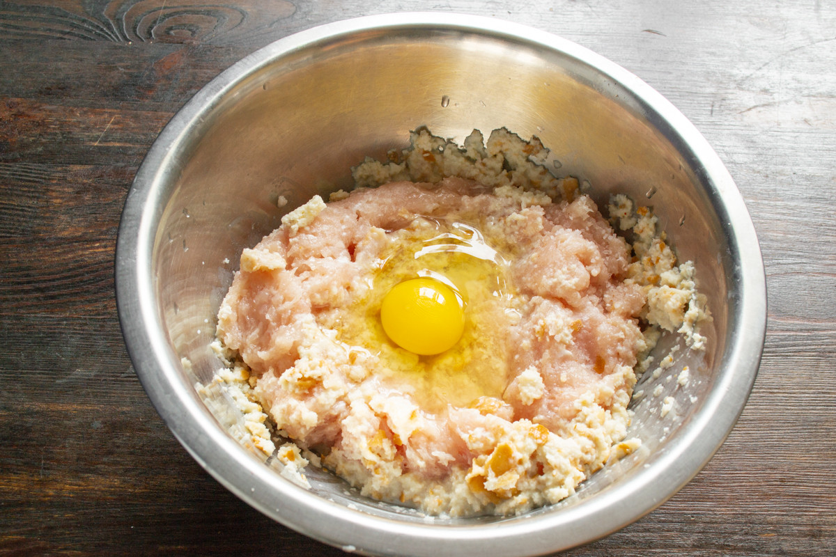 Разбиваем в фарш куриное яйцо, по вкусу солим. Вы можете добавить любимые приправы для курицы и натертую на мелкой терке луковицу на этом этапе.
