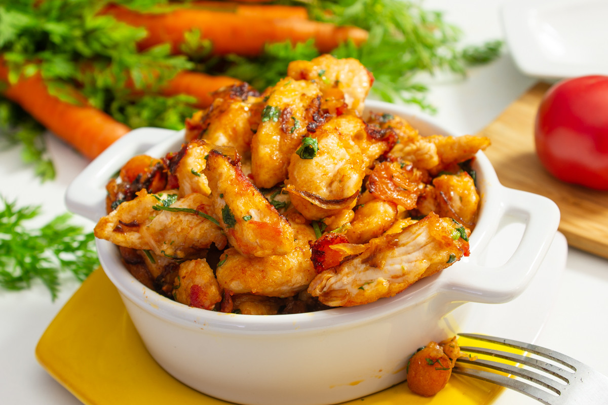 Спелые красные помидоры кладем на 1 минуту в кипящую воду. Затем сразу охлаждаем в холодной воде, делаем надрез крест-накрест и снимаем кожицу. Очищенные от кожицы помидоры нарезаем мелко, кладем в сковороду к курице. По вкусу солим, насыпаем по ½ чайной ложки молотой сладкой паприки и перца. Можно добавить щепотку сахара, если помидоры с кислинкой. Если нет свежих помидоров, то замените их резанными, консервированными в собственном соку.