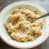 Добавляем куриный фарш. В этом рецепте фарш из куриного филе без кожи. В домашних условиях пропустите нарезанное кубиками филе через мясорубку со средней решеткой или порубите филе топориком прямо на разделочной доске.