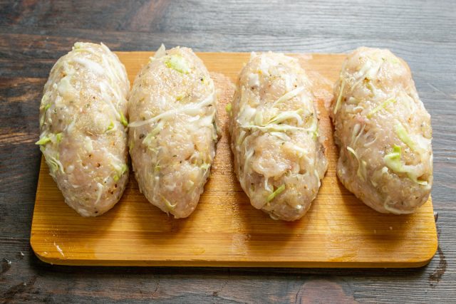 Смазываем ладони рапсовым маслом. Делим фарш на четыре равные части, формируем овальные котлеты, кладем на доску, смазанную маслом.