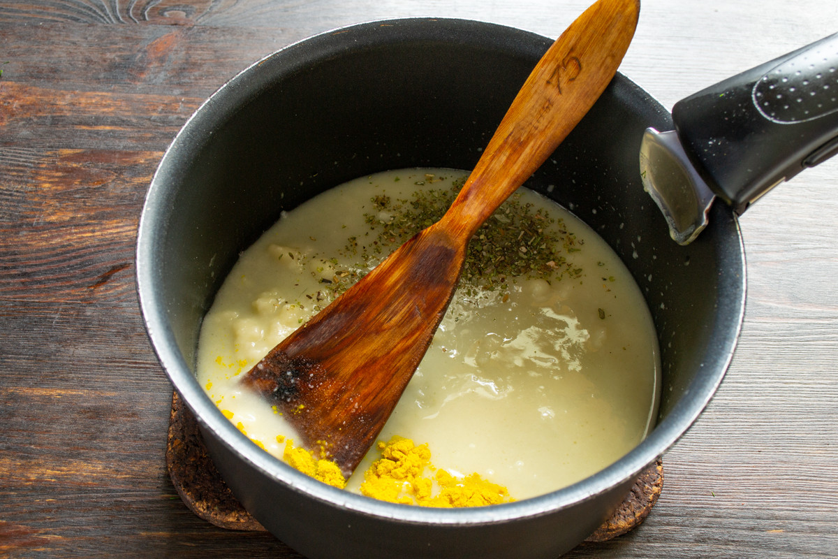 Готовим соус. Растапливаем сливочное масло. Насыпаем рисовую муку (можно заменить пшеничной). Обжариваем муку в масле 2 минуты, тонкой струйкой вливаем 10%-е сливки, размешиваем соус. Насыпаем молотую куркуму и половину чайной ложки специй «прованские травы». Замените сливки нежирным молоком, если нужно приготовить менее калорийное блюдо.