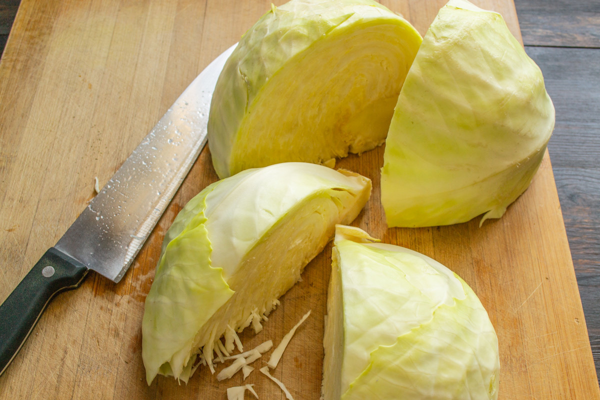 С кочана капусты снимаем верхние листья. Разрезаем кочан на четыре части, вырезаем кочерыжку. Выбирайте плотный кочан с упругими белыми листьями, такая капуста будет хрустящей.