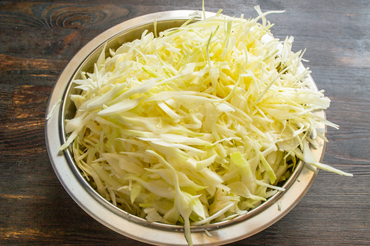 С помощью овощерезки или широким ножом шинкуем капусту узкими полосками, чем тоньше нарезка, тем лучше. Постарайтесь нарезать стружки не толще трех миллиметров.