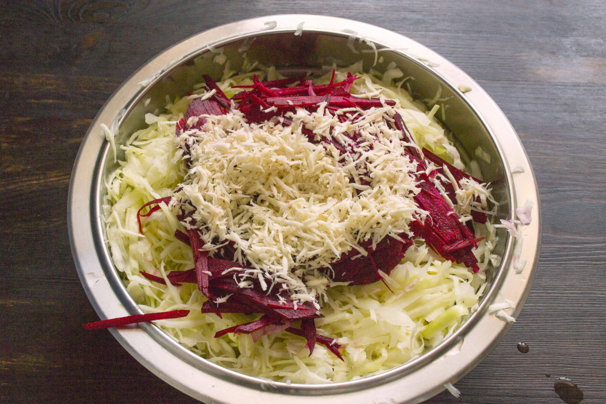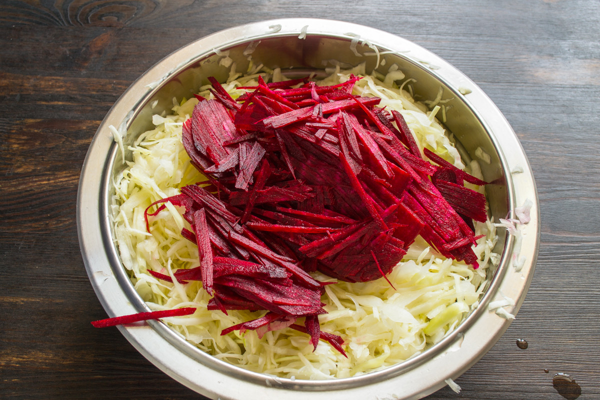 Свеклу моем щеткой, счищаем кожуру. Нарезаем очищенную свеклу тонкой соломкой. Добавляем нарезанную свеклу к капусте.