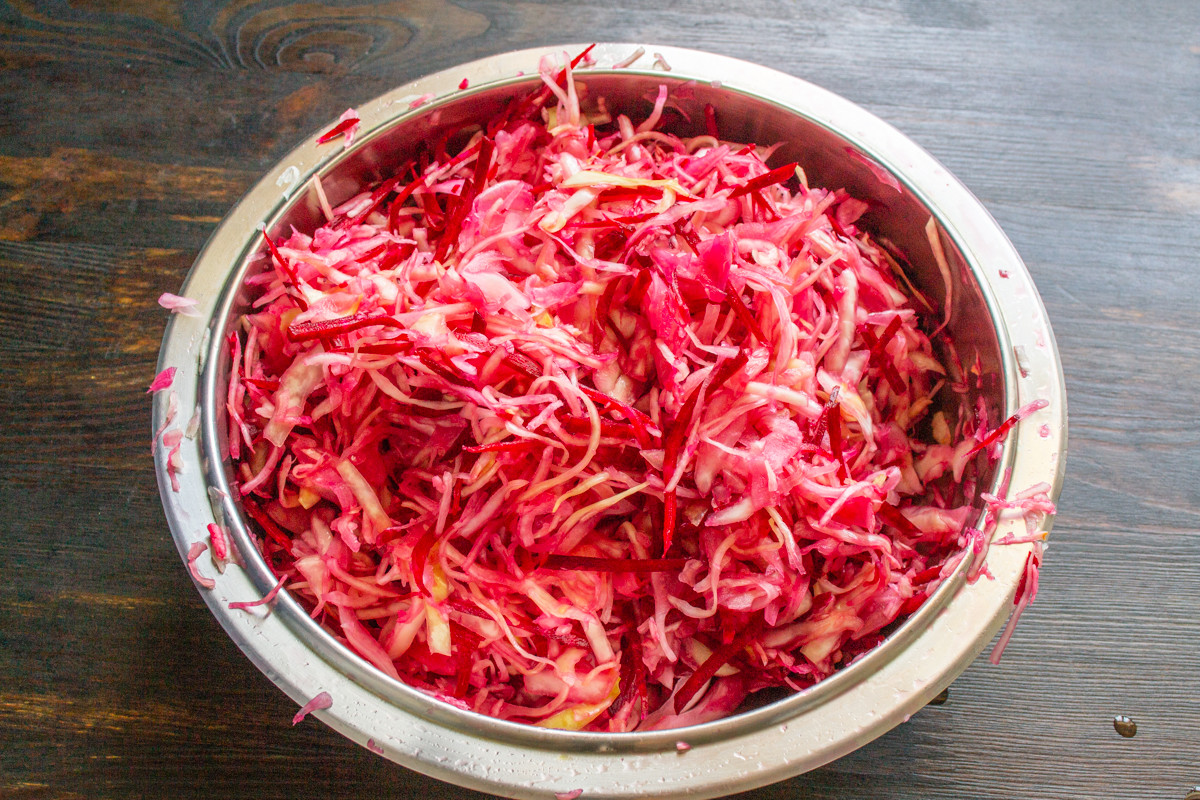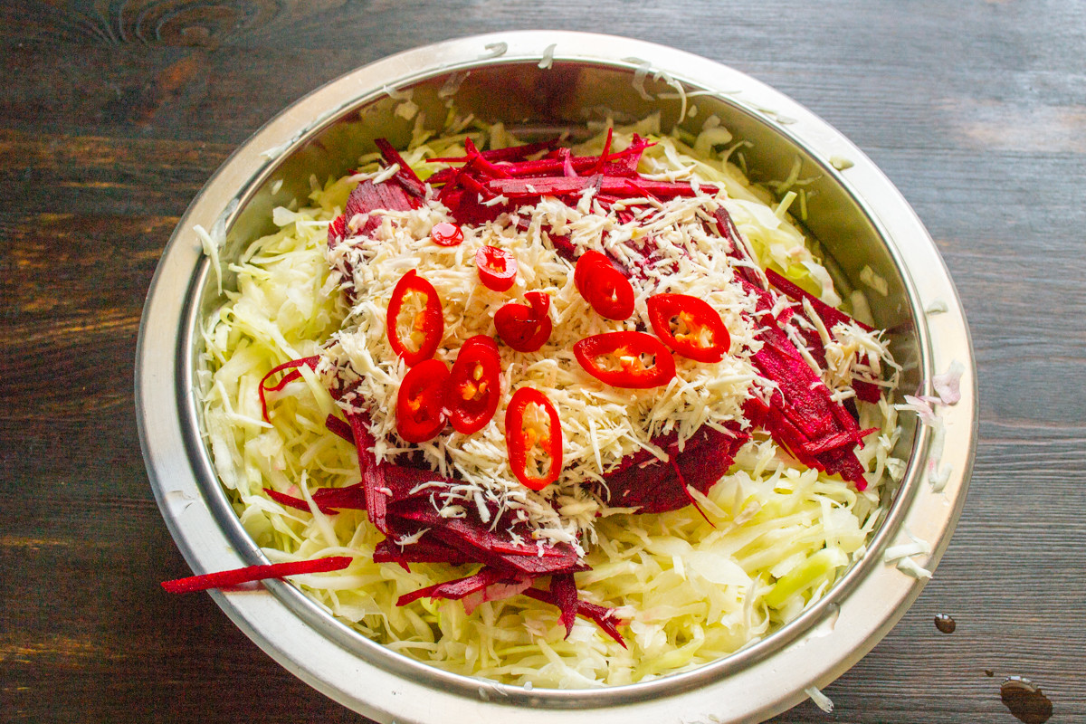 Надеваем тонкие резиновые перчатки и хорошенько перемешиваем овощи, одновременно немного разминаем, чтобы свекла пустила сок.