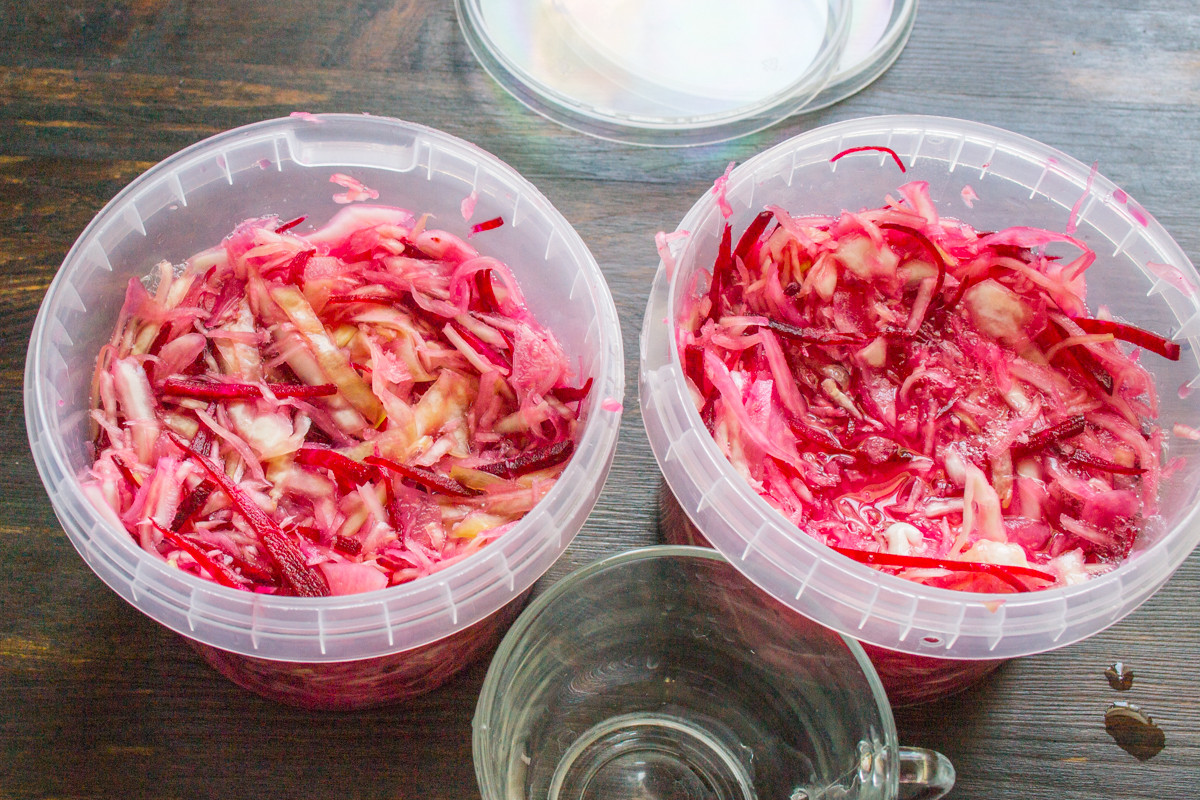 Укладываем капусту с хреном и свеклой в чистые и сухие банки или контейнеры. Наполняем тару примерно на 2\3 объема, утрамбовывать не нужно, пусть лежит свободно. Вливаем холодную фильтрованную или кипяченую воду так, чтобы овощи не торчали над водой. Накрываем банки крышками, ставим в темное и теплое место. Ферментация быстрее начнется, если температура в помещении находится в пределах 22-24 градуса по Цельсию. В прохладном помещении процесс удлиняется.