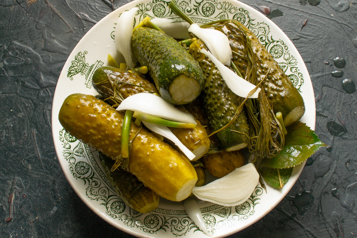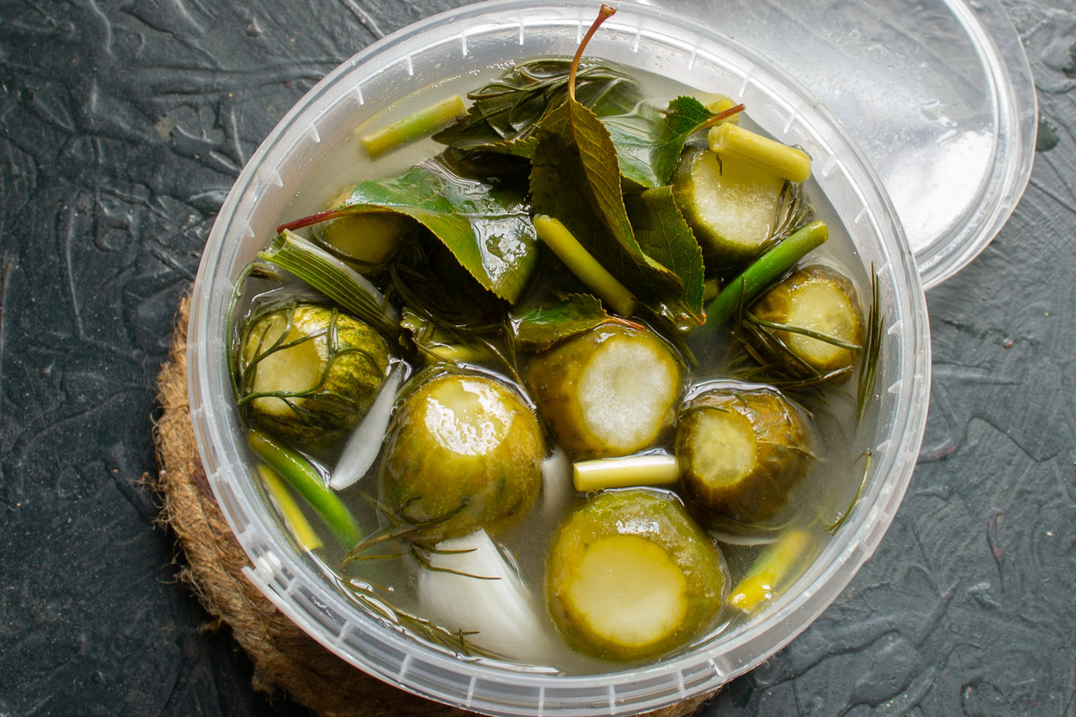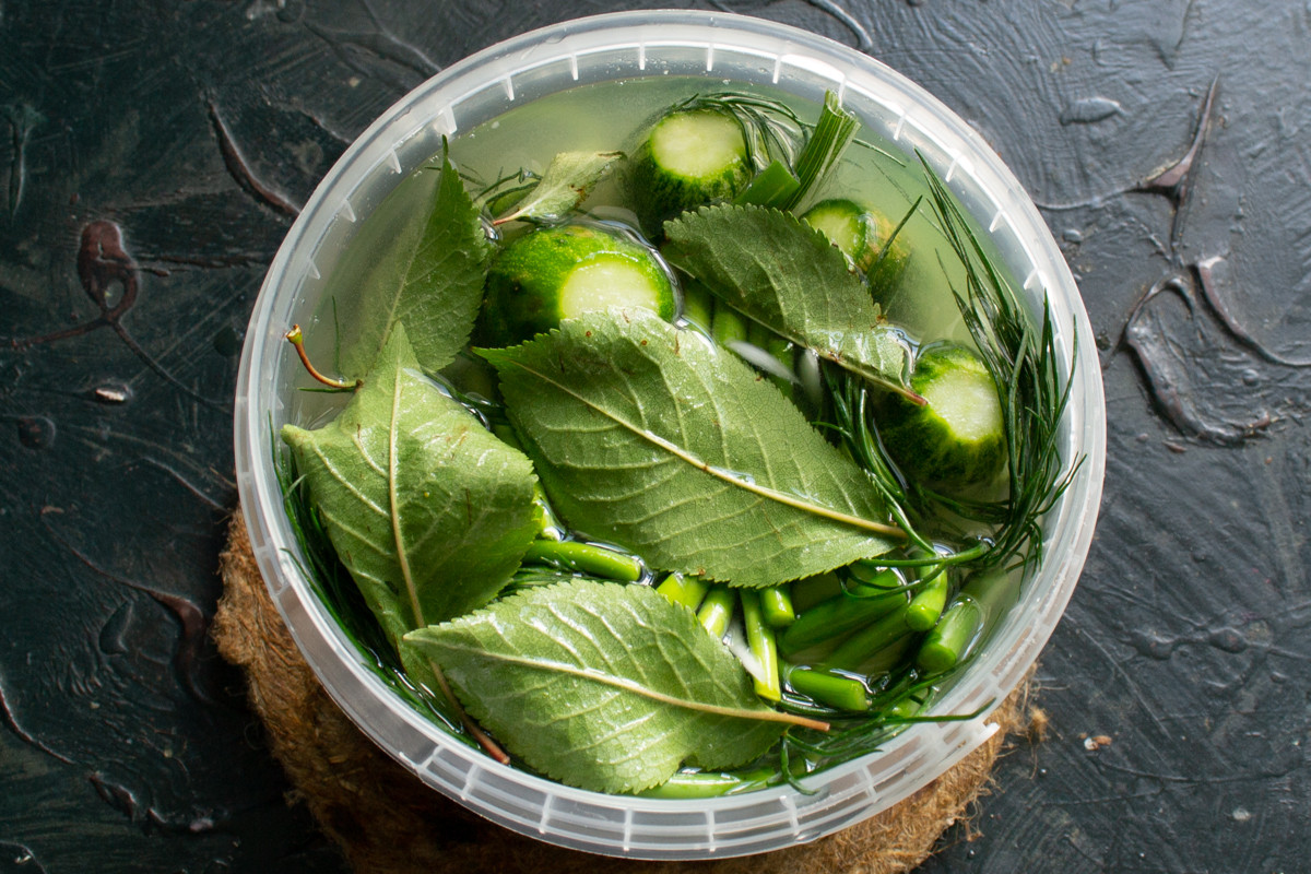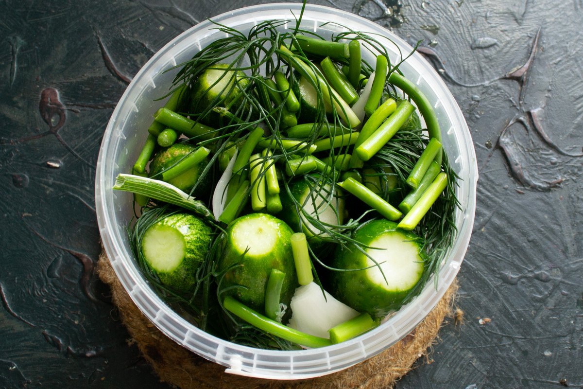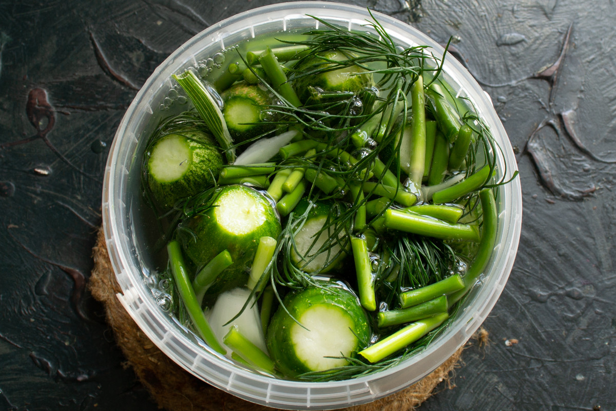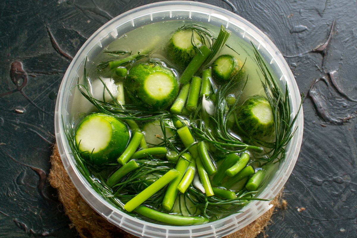 Оставляем огурцы в теплом месте на 2-3 дня. Уже через 24 часа появятся первые пузырьки на поверхности рассола, это верный признак начавшегося брожения. Ещё через 24 часа цвет огурцов постепенно сменится с ярко-зеленого на болотный.