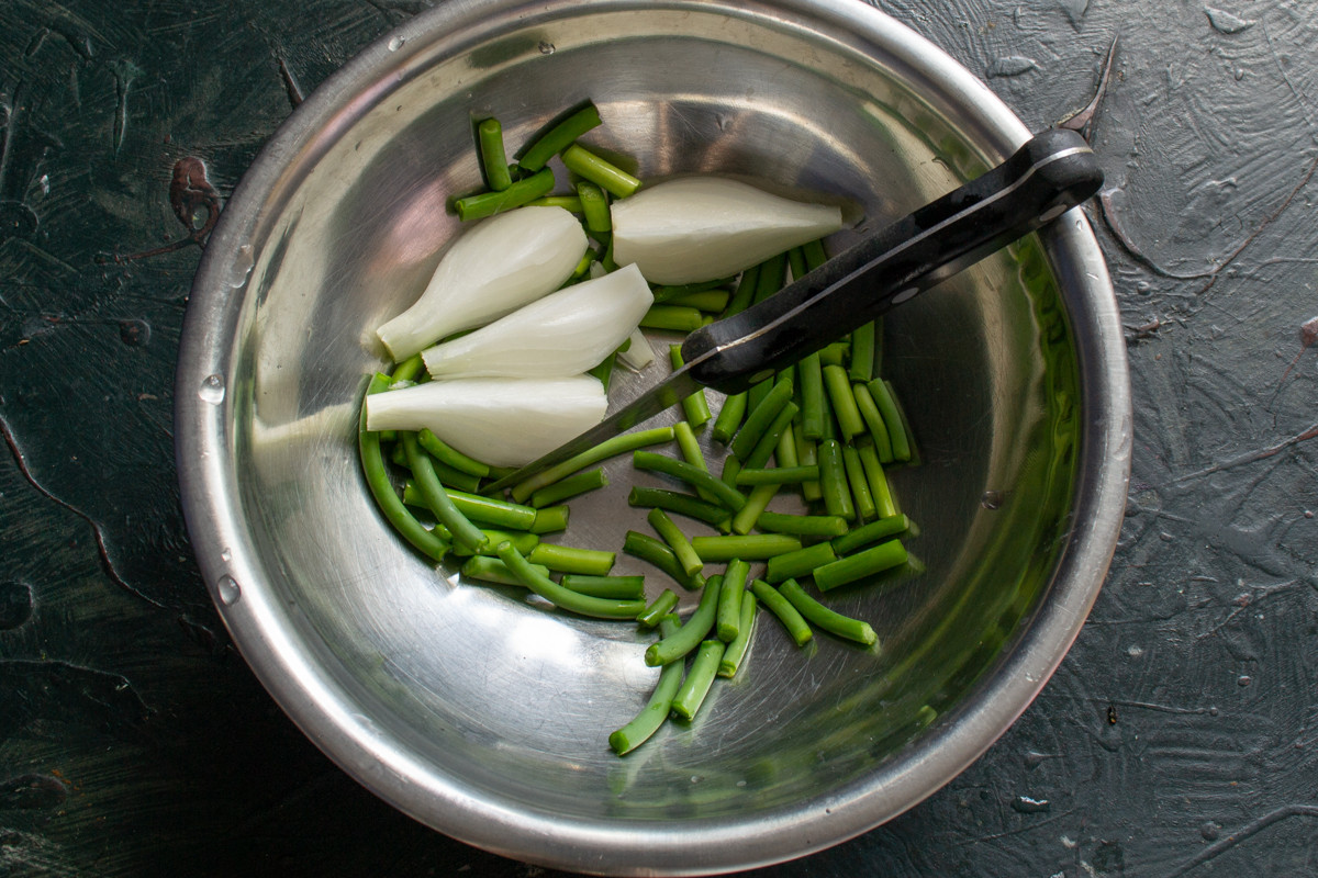 Срезаем цветоносы с чесночных стрелок, режем стрелки кусочками длиной 3 сантиметра. Луковицу разрезаем на 4 части. Нарежьте пластинками 2 дольки чеснока, если нет чесночных стрелок.