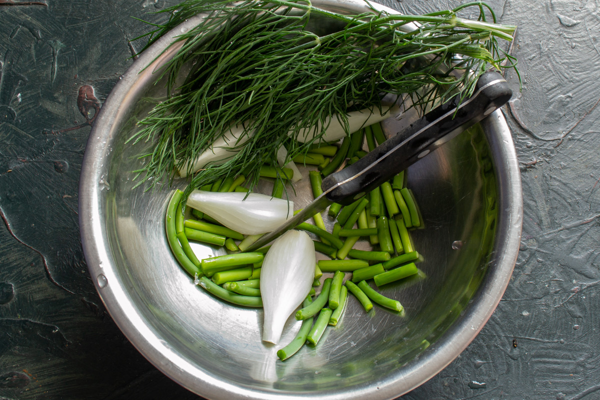 Небольшой пучок укропа замачиваем в воде, отряхиваем. Можно вместо зелени положить несколько соцветий укропа.