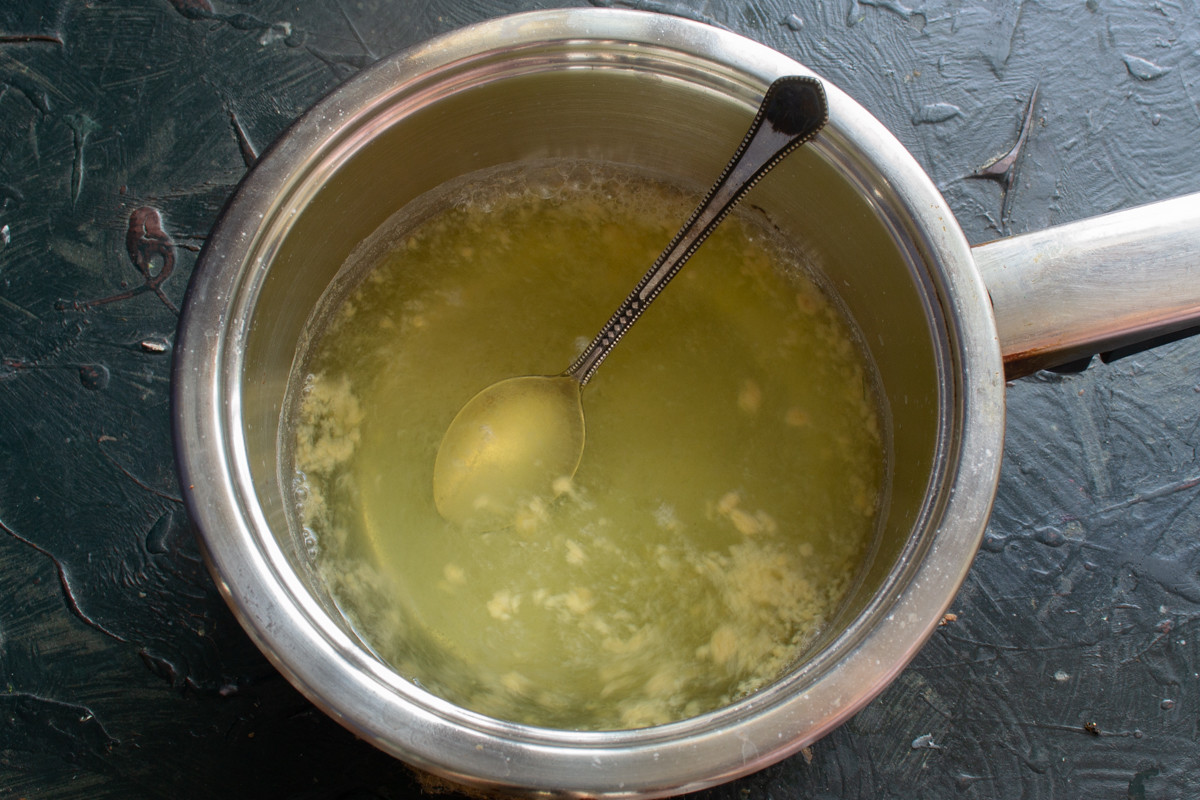 Вливаем в ведерко воду. Воду сливаем в кастрюлю, так легко определить необходимый объем. Воду для засолки используйте родниковую или фильтрованную из-под крана. Не советую бутилированную, в бутилированной воде могут быть ненужные для ферментации добавки.