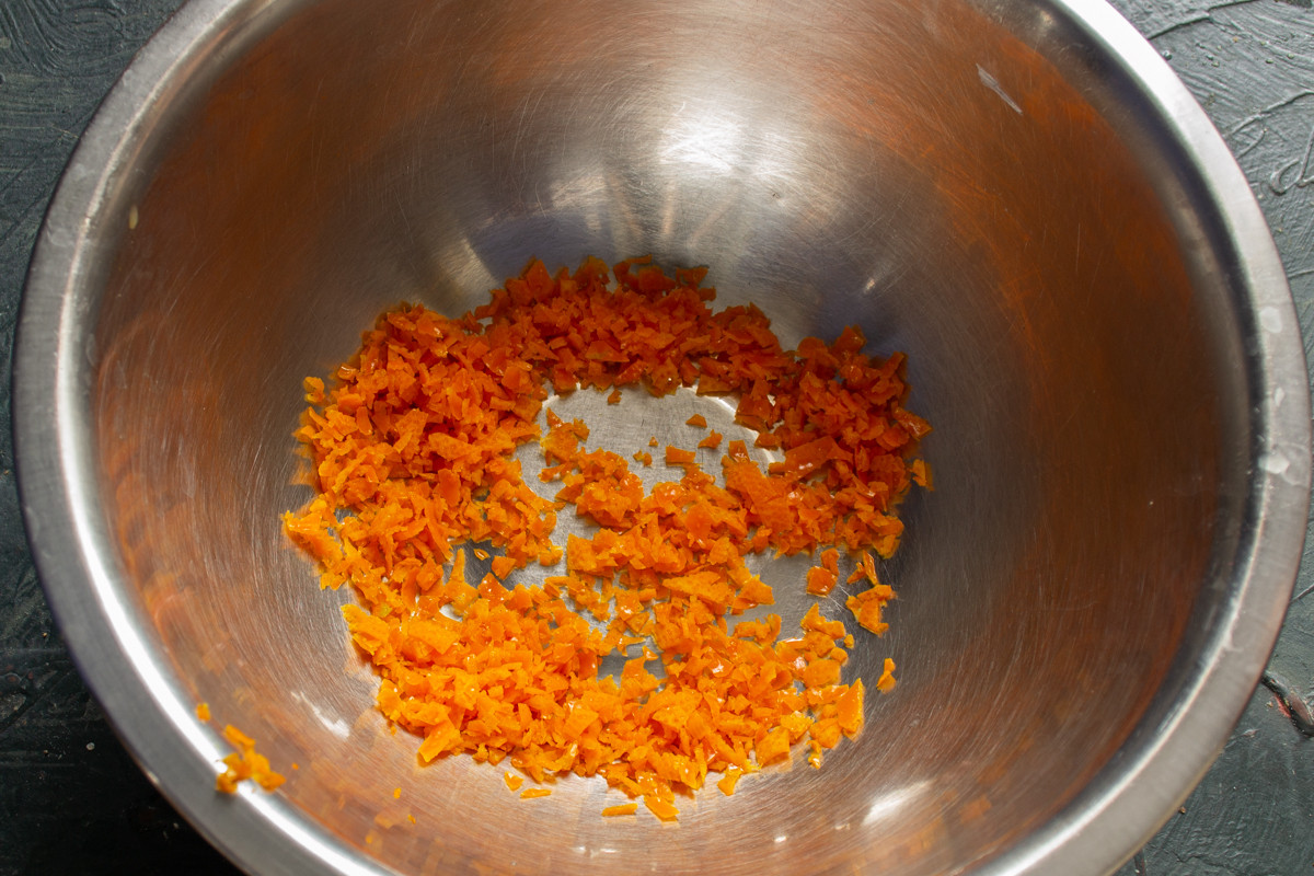 Сырую морковь натираем на крупной тёрке. Кладём в миску тёртую морковь.