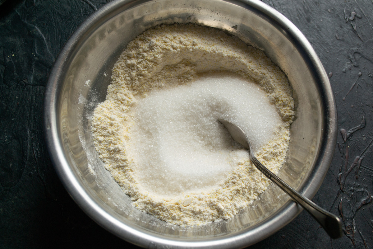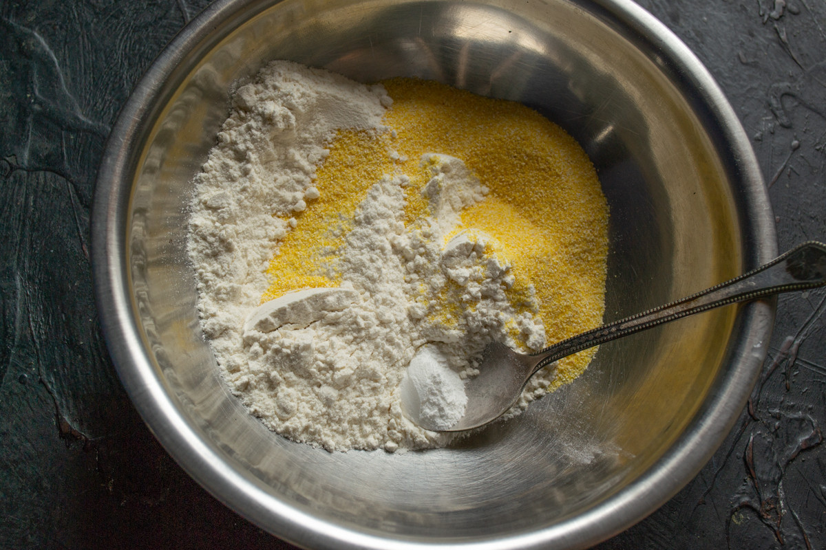 Смешиваем сухие ингредиенты: кукурузную муку, пшеничную муку высшего сорта и разрыхлитель теста. Не используйте кукурузную крупу для этого рецепта, она не пропечется и печенье будет не съедобным. Нужна мука или мелкая полента, крупу придется измельчить в кофемолке.