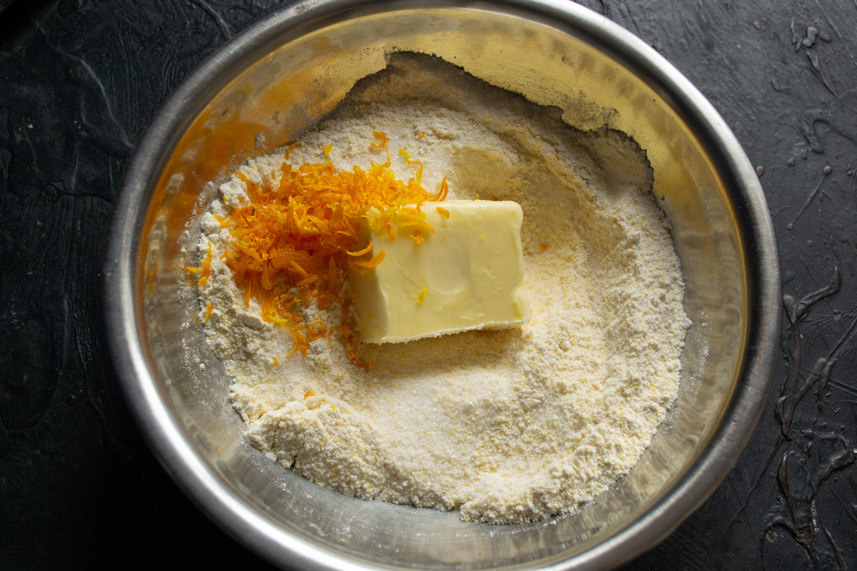 Добавляем холодное сливочное масло. Апельсин тщательно моем, ошпариваем кипятком, на мелко тёрке натираем тонкий слой оранжевой цедры, стараясь не цеплять белую кожуру – она горчит.