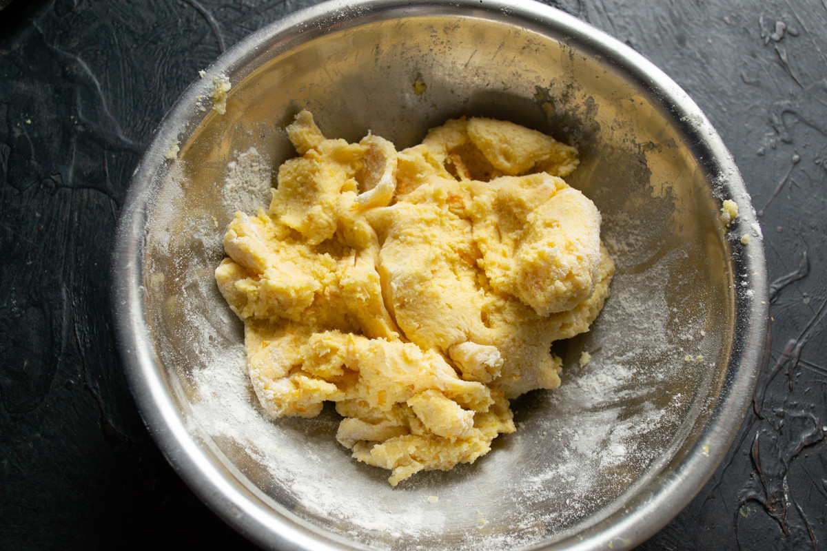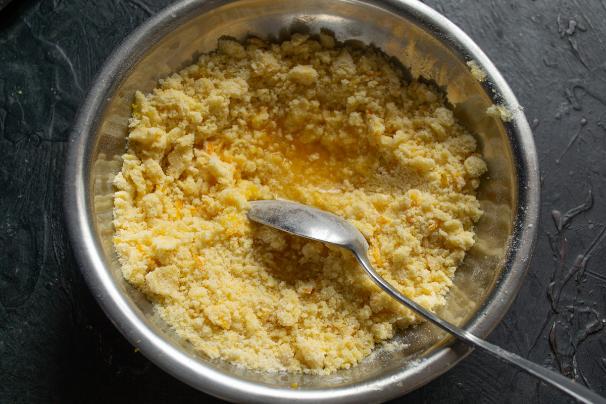 Растираем масло с сухими ингредиентами в крошку, затем вливаем апельсиновый сок. Это печенье я готовила без яиц, можно добавить 1 яичный желток на этом этапе, так тесто лучше склеиться, но это не обязательно.