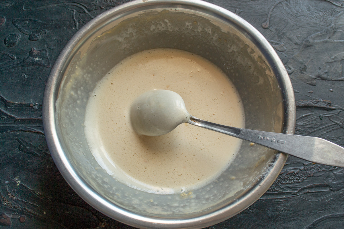Чтобы тесто для налистников получилось гладким, берём погружной блендер и взбиваем тесто – таким образом просто избавится от незамеченных комочков муки. Готовое тесто оставляем на 30 минут при комнатной температуре. Блинное тесто хранится в холодильнике до 10 часов, так что можно готовить заранее и оставлять к завтраку.