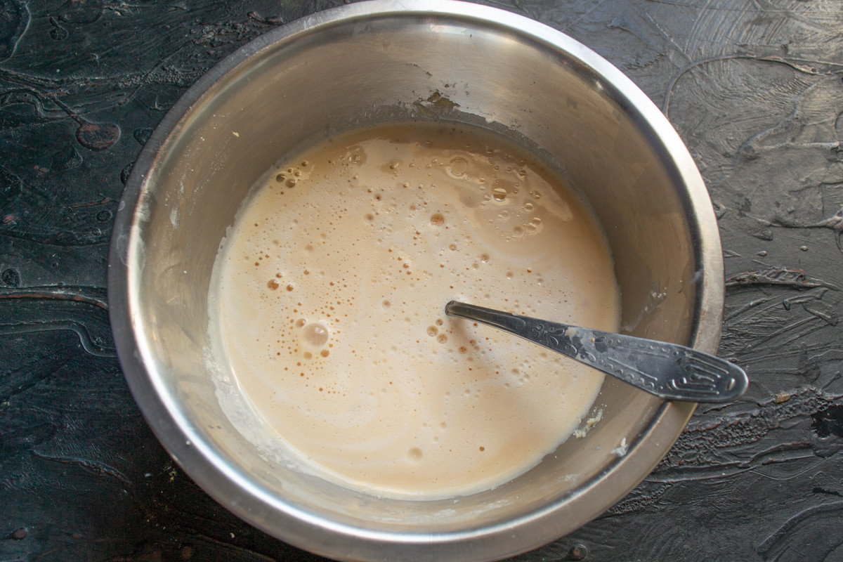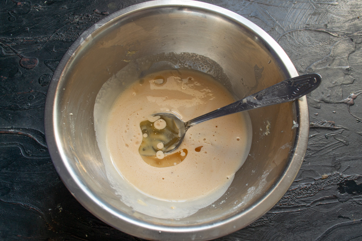 Наливаем холодное молоко, взбиваем жидкие ингредиенты венчиком.