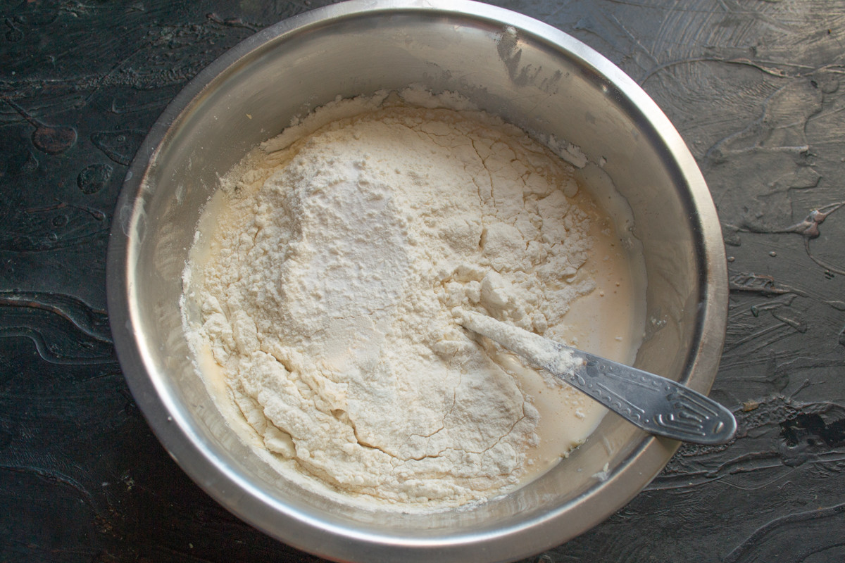 Насыпаем пшеничную муку. Тесто для налистников можно готовить разными способами, вручную немного дольше, в кухонном комбайне или блендере за пару минут.