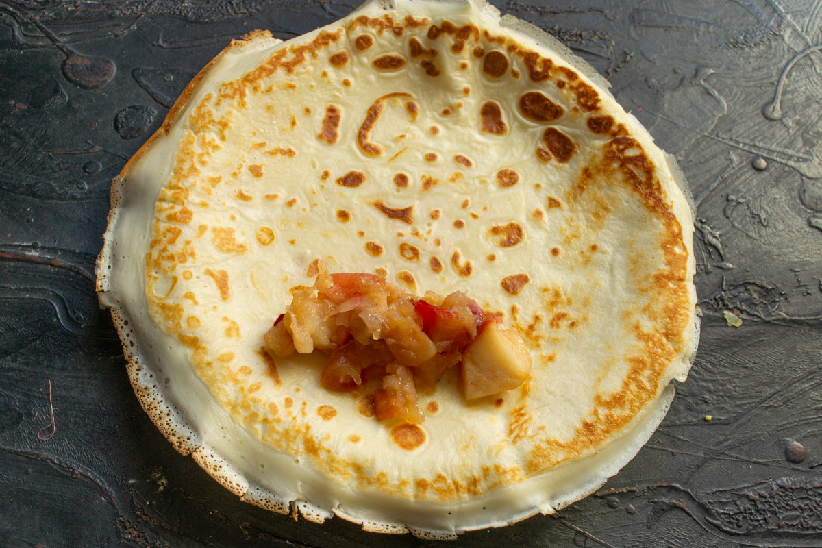 Сковороду диаметром 28-30 сантиметров сильно разогреваем, смазываем нейтральным растительным маслом с помощью силиконовой кисти. Выливаем на разогретую сковороду неполный половник теста, размазываем тонким слоем. Жарим налистники до золотистого цвета с двух сторон. Снимаем налистник со сковороды, смазываем сливочным маслом, кладём на край примерно 40 г запеченных яблок.