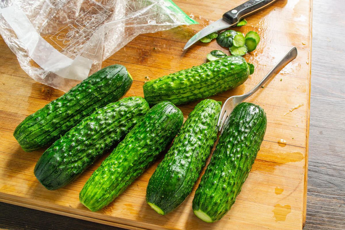 Тщательно моем огурцы. Для быстрой засолки нужно создать определенные условия. Во-первых, срезаем кончики-хвостики. Во-вторых, вооружаемся вилкой и царапаем огурцы вдоль по всему периметру. С концов и в процарапанные борозды соль проникнет лучше, чем через целую нетронутую огуречную кожуру.