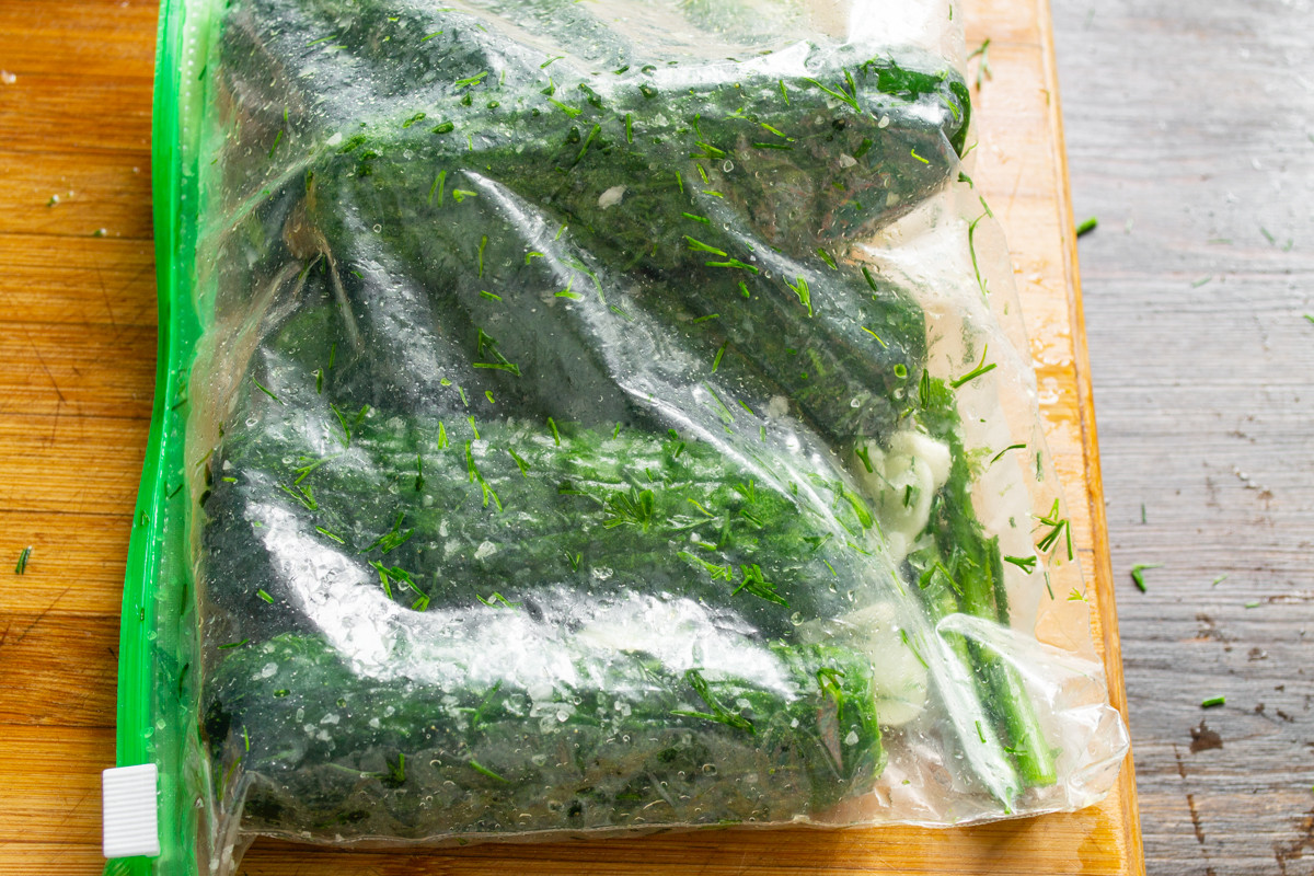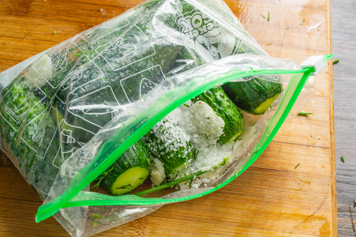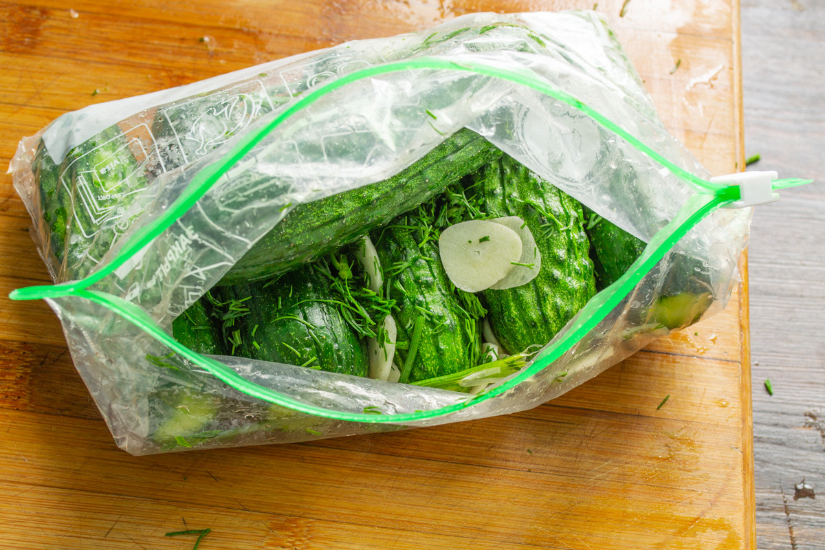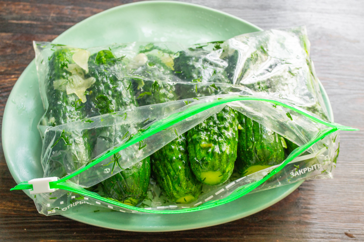 Закрываем пакет на застежку, хорошенько трясем и слегка разминаем. В процессе выделится сок, соль «покусает» огурчики, получится пряный рассол без воды. Кстати, можно натереть какой-нибудь бракованный огурец на терке и добавить в пакет.