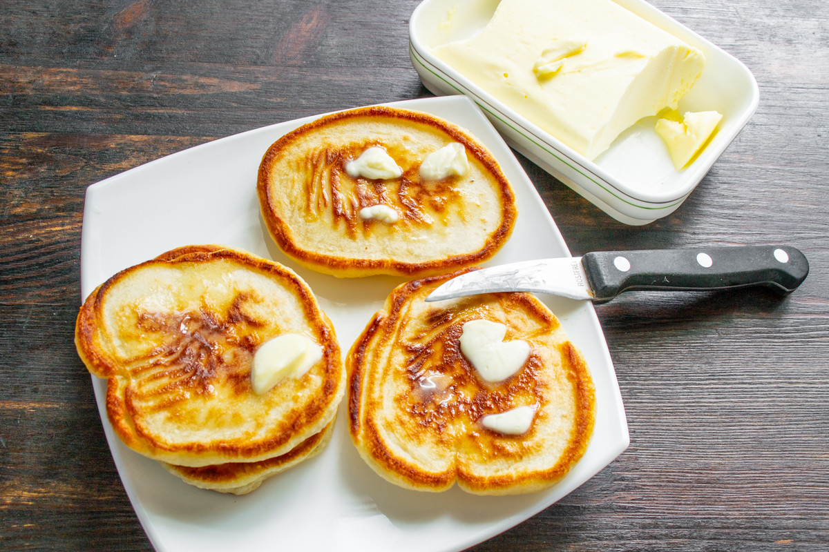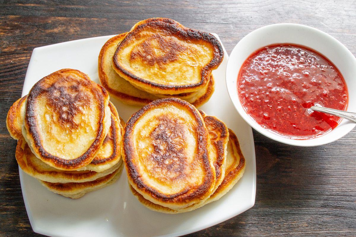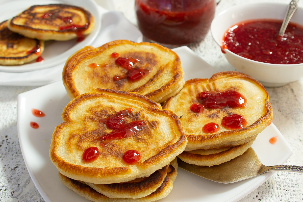 Пышные, воздушные, горячие, пропитанные сливочным маслом оладьи на кефире с клубничным киселем – изумительный завтрак!