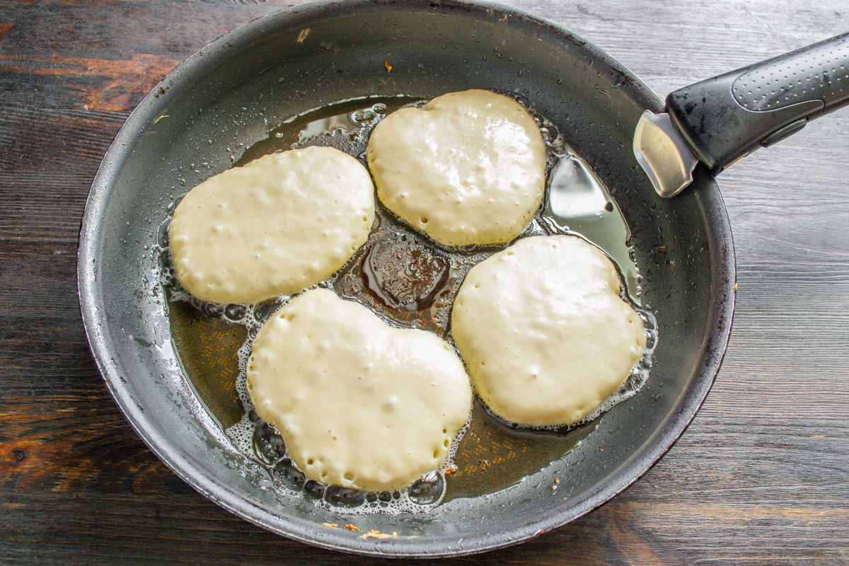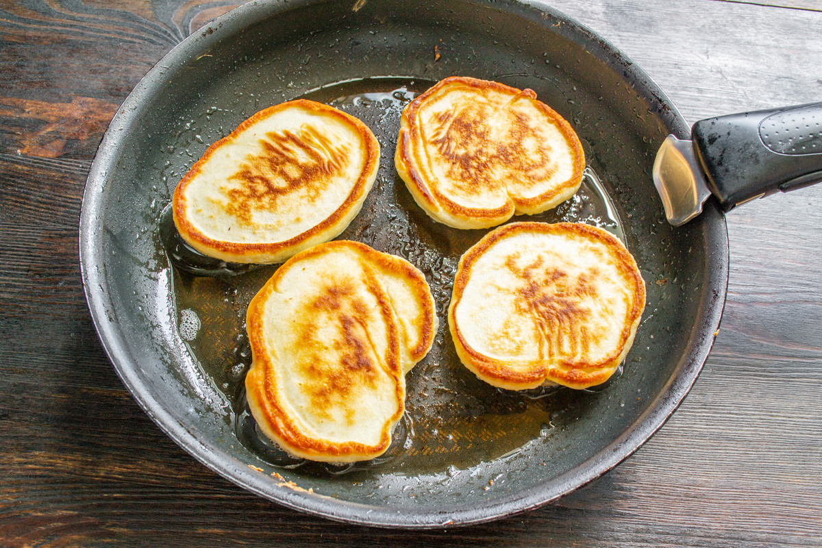 Поджариваем оладьи до золотистого цвета на небольшом огне. Если нажать пальцем и тесто пружинит, это значит, что оладушки испеклись.